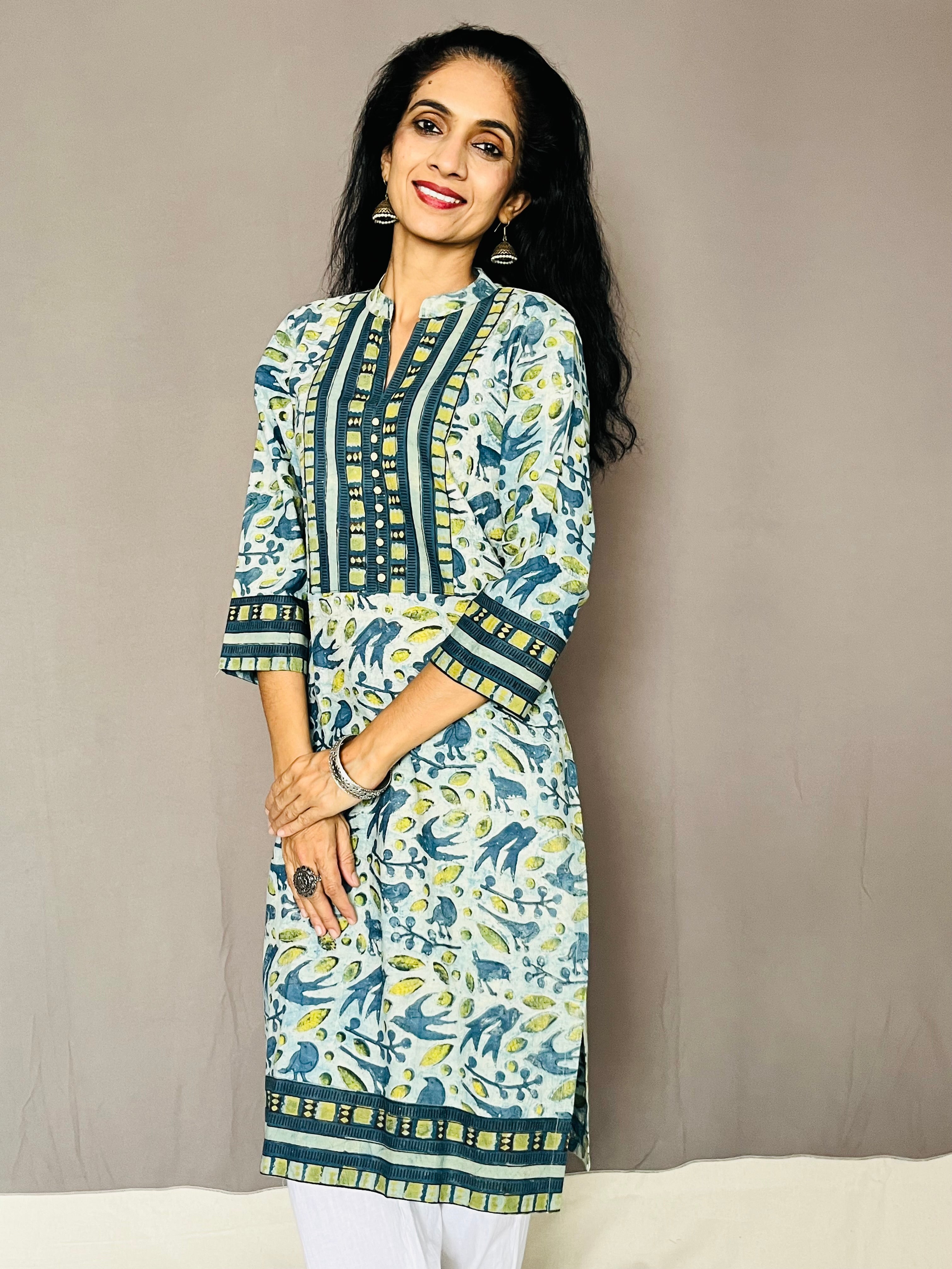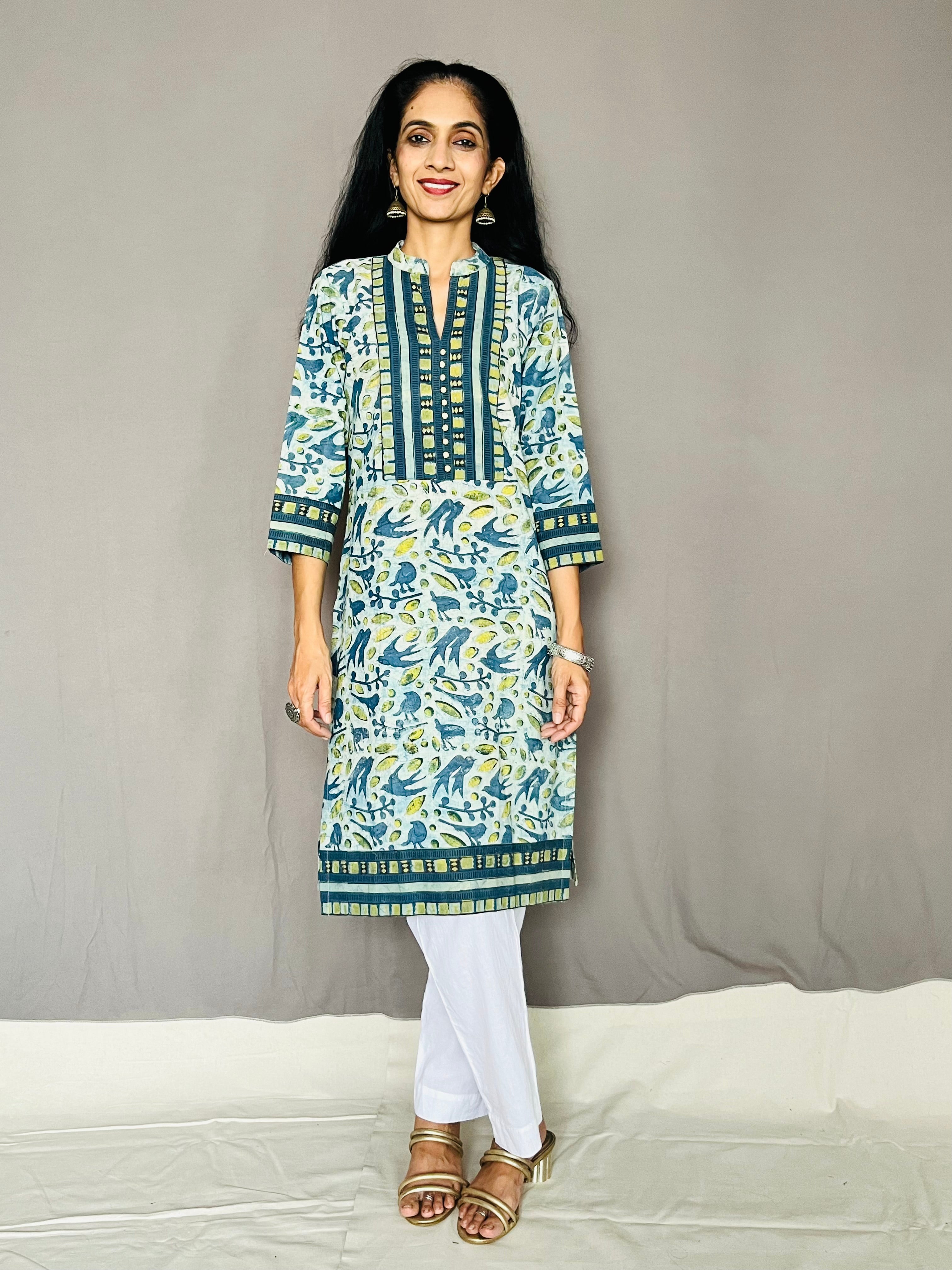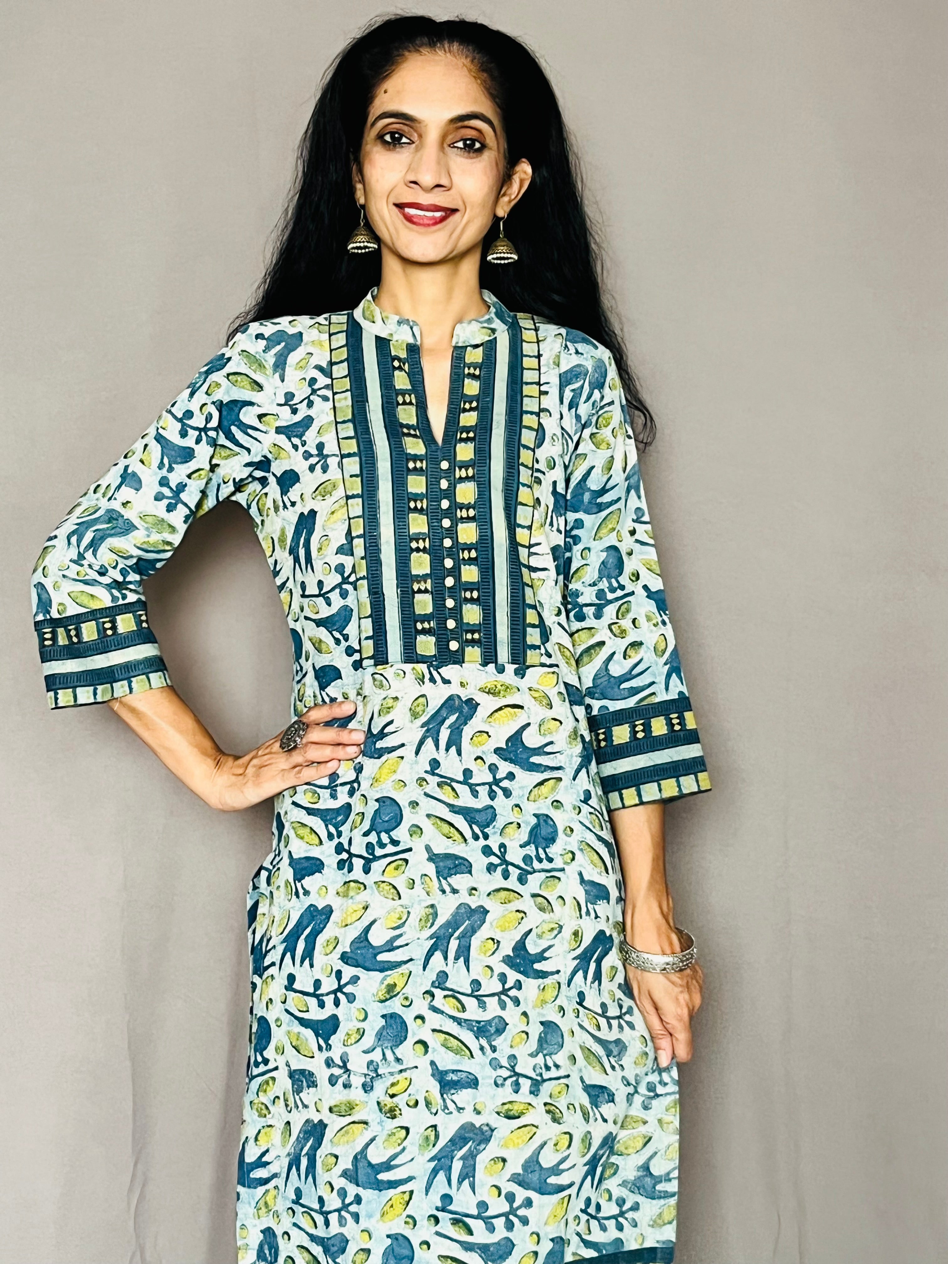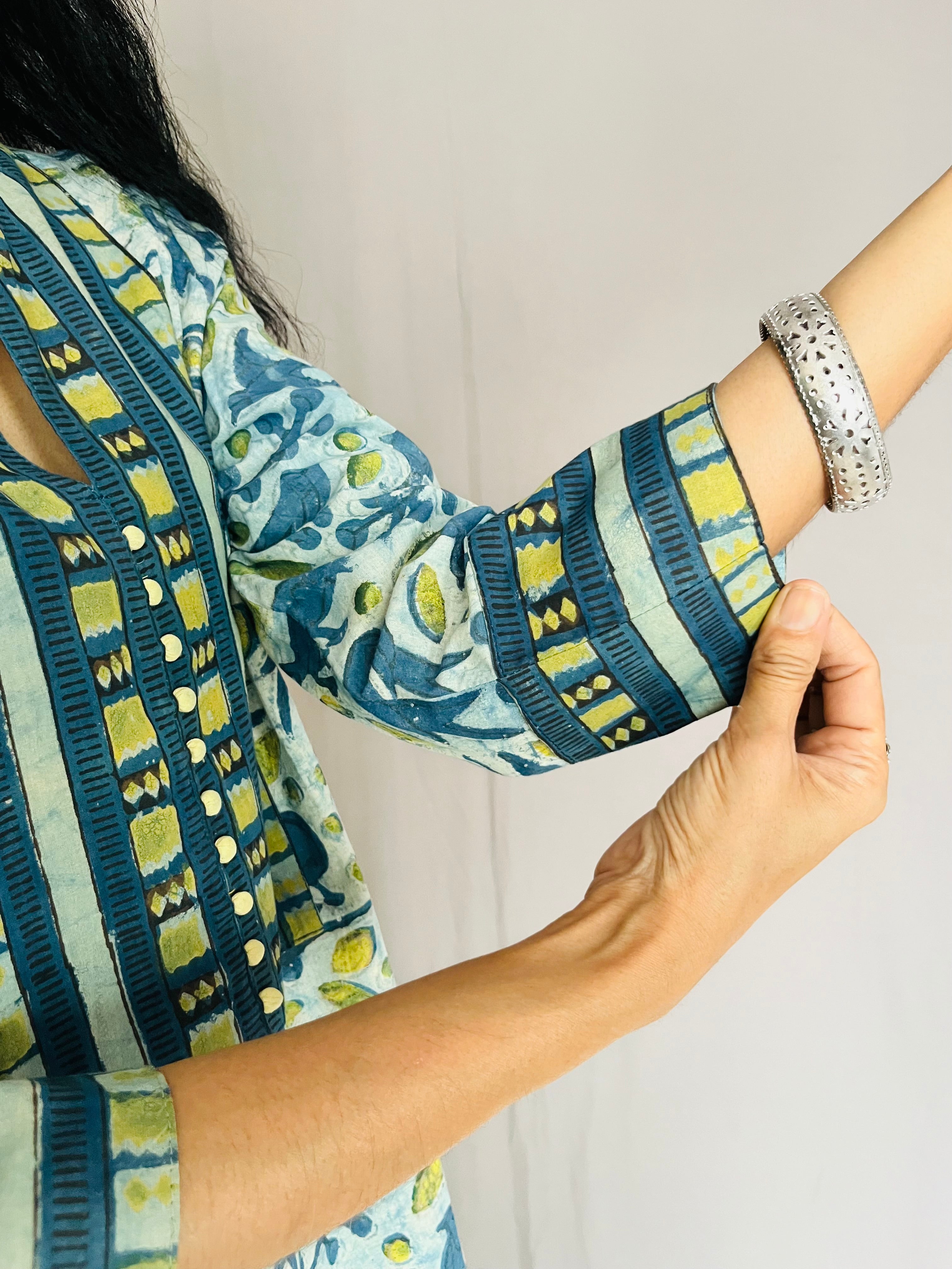 In the artful process of hand block-printing and stitching, variations are likely to come into existence. These irregularities are the hallmark of all handmade products and give each style a unique identity.Colours tend to be perceived differently depending on factors such as shot angles, lighting, background tones and colour temperatures. As a result, prints and colours may vary. Nevertheless, we strive to match the tones as close to the original product colours as possible.