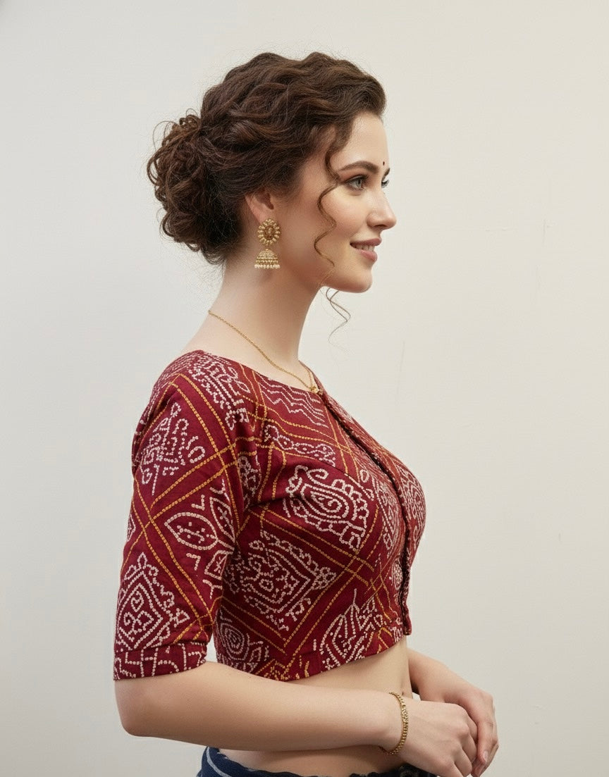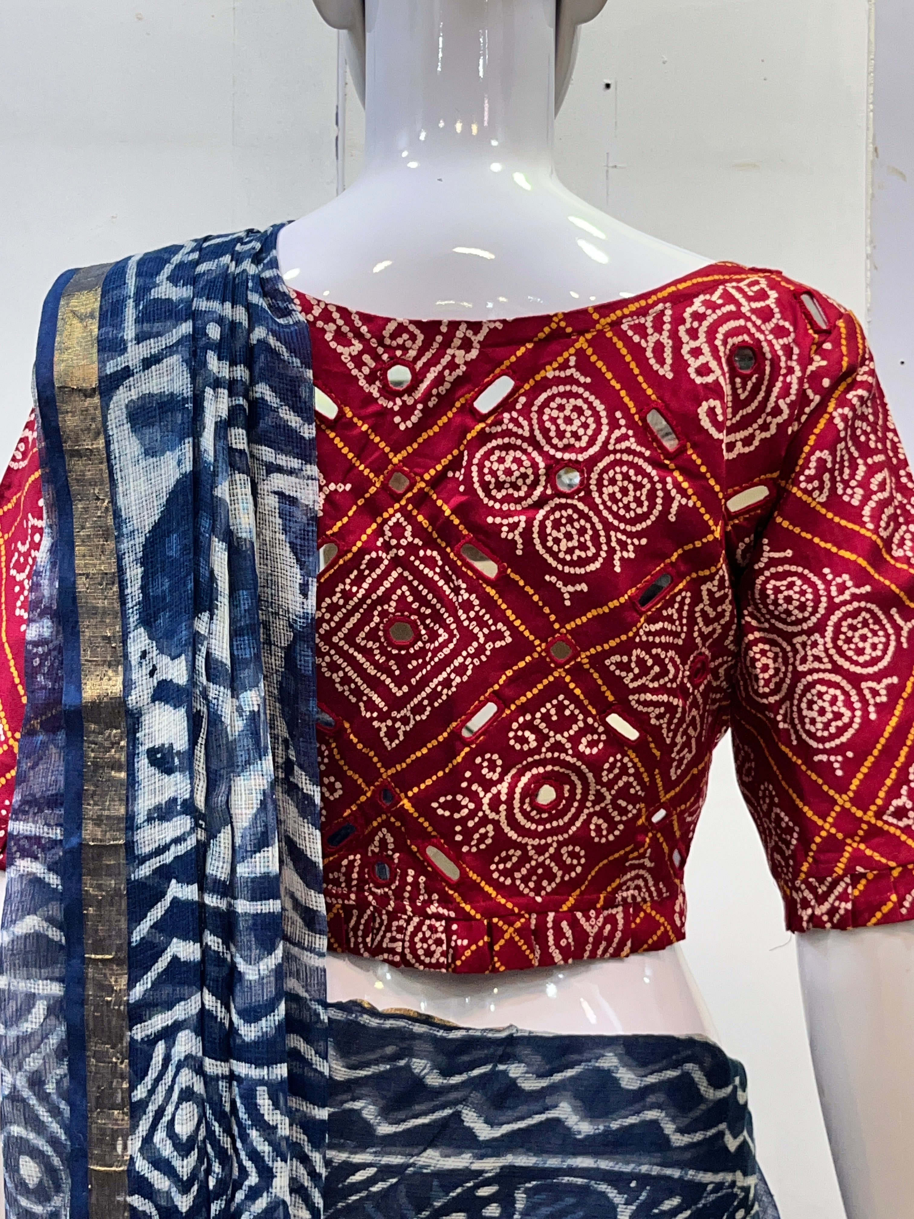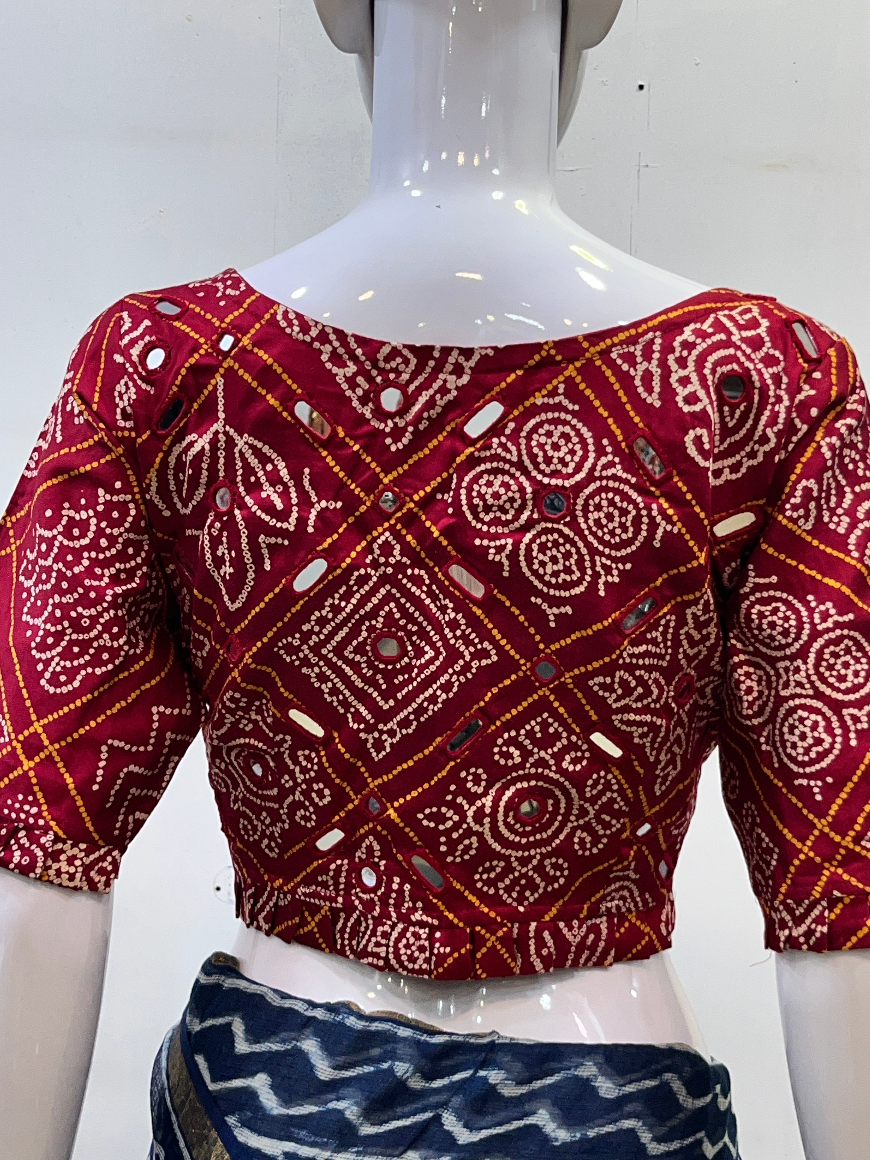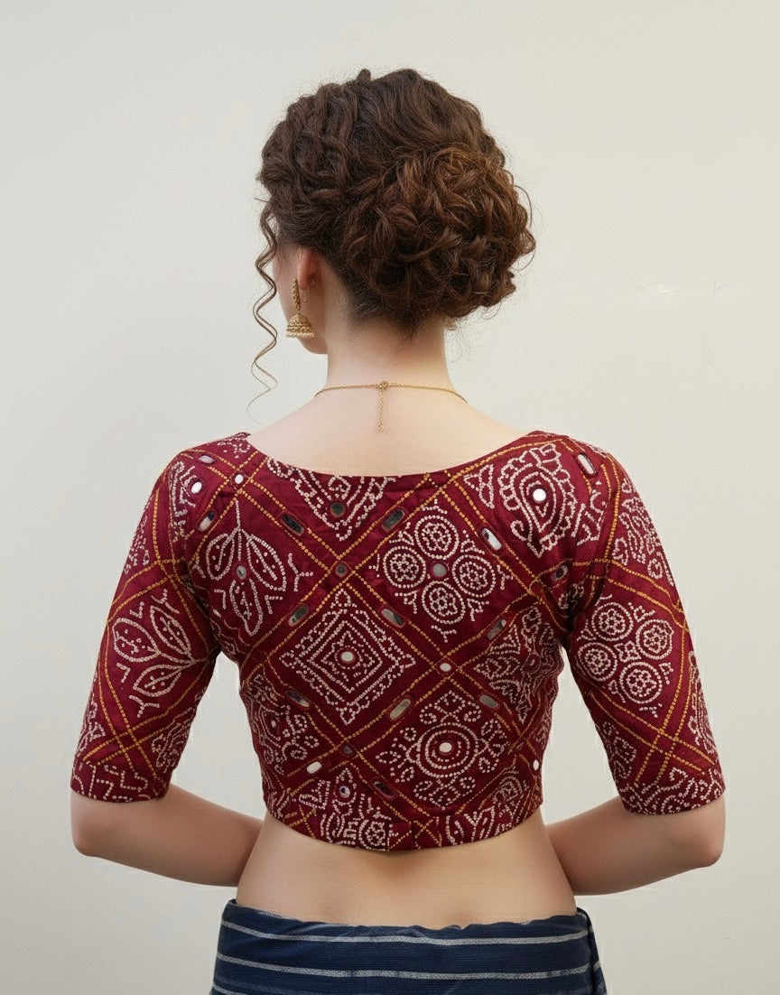 Our exquisite Ajrakh Mashru Silk Mirror Work Blouse, handcrafted by master artisans of Kutch. Made from the luxurious Mashru silk, this blouse combines a smooth, lustrous finish with traditional Ajrakh hand block prints. Intricate mirror work detailing adds a festive sparkle, making it perfect for weddings, celebrations, and premium ethnic styling.