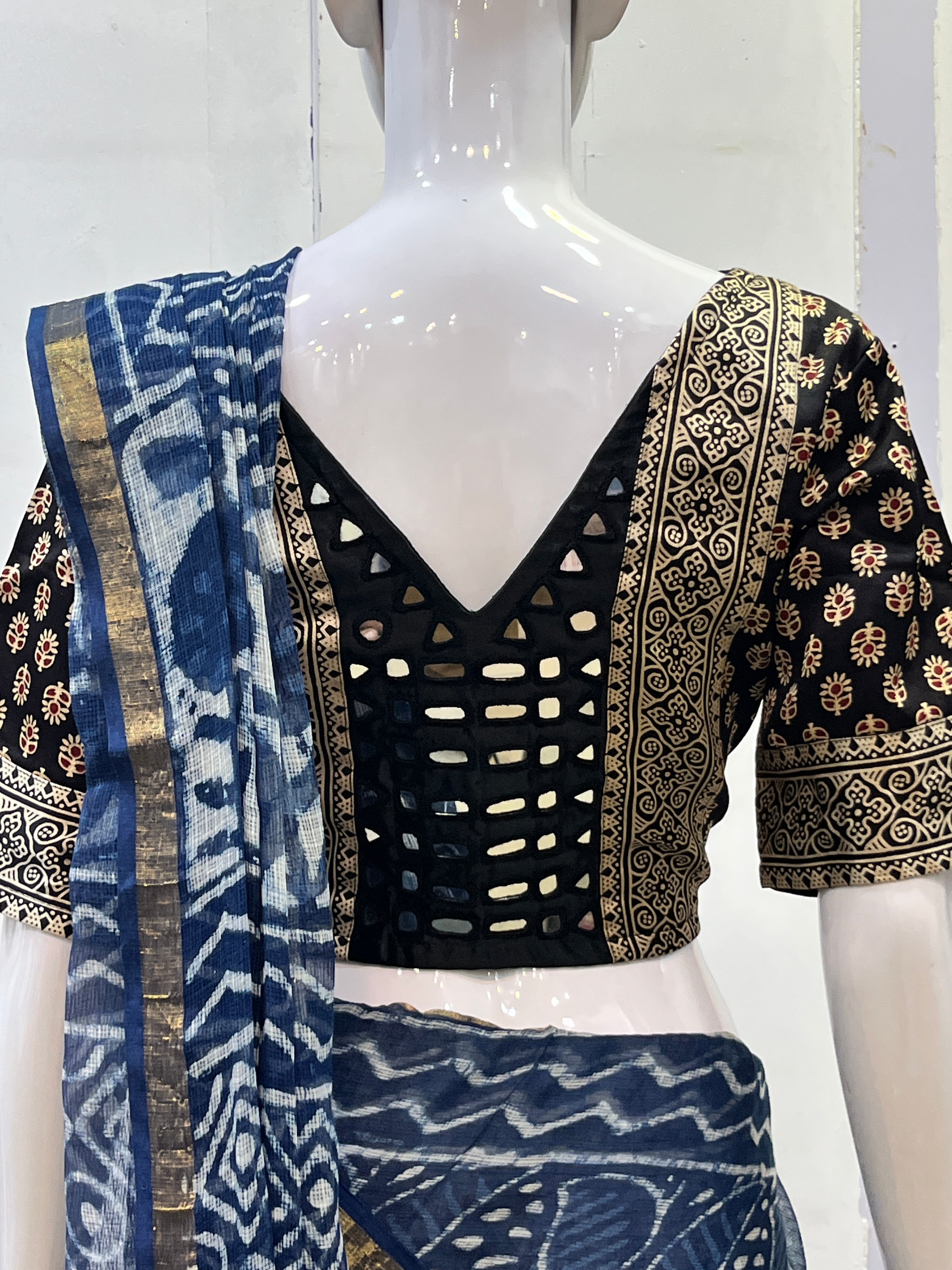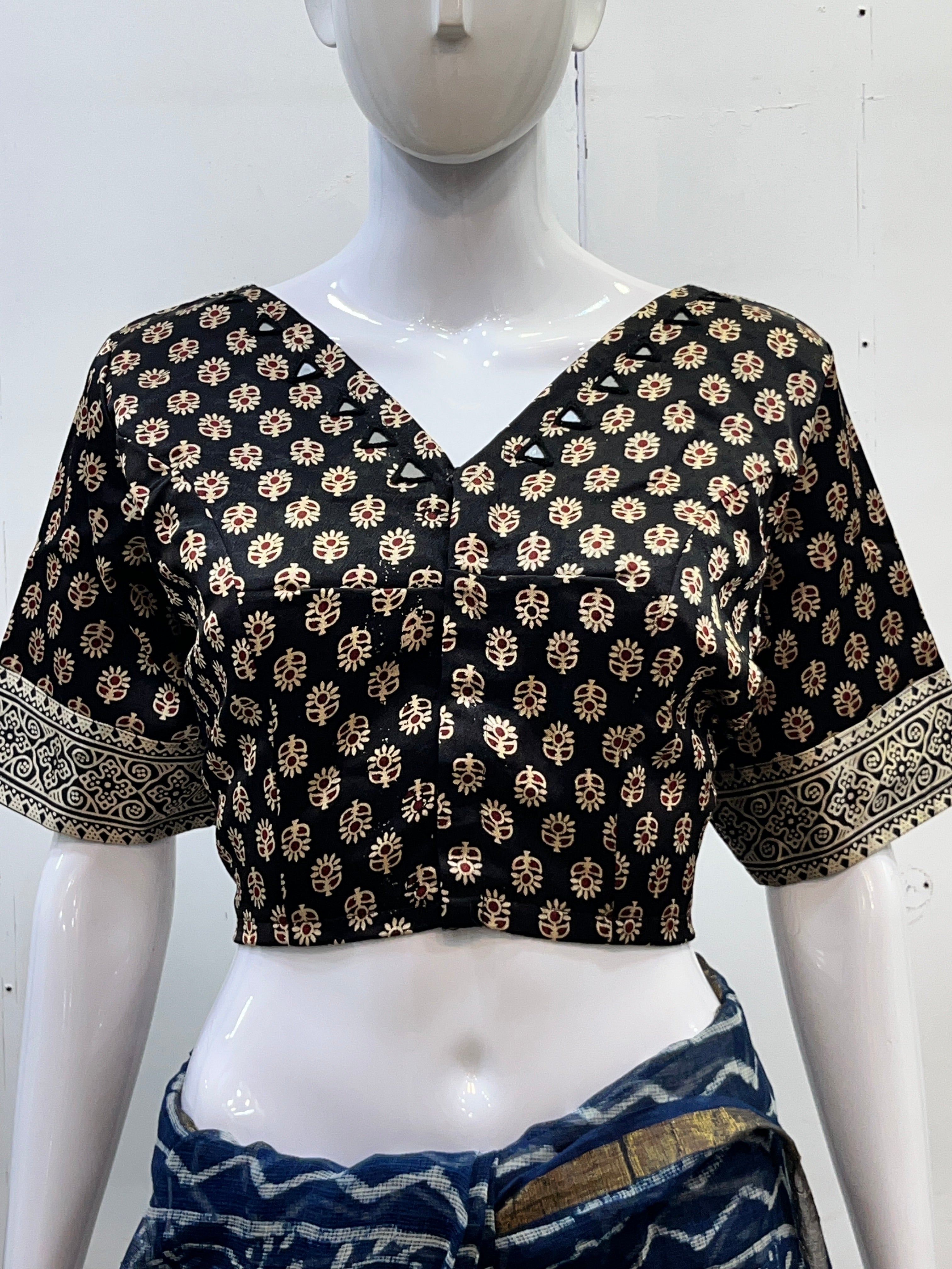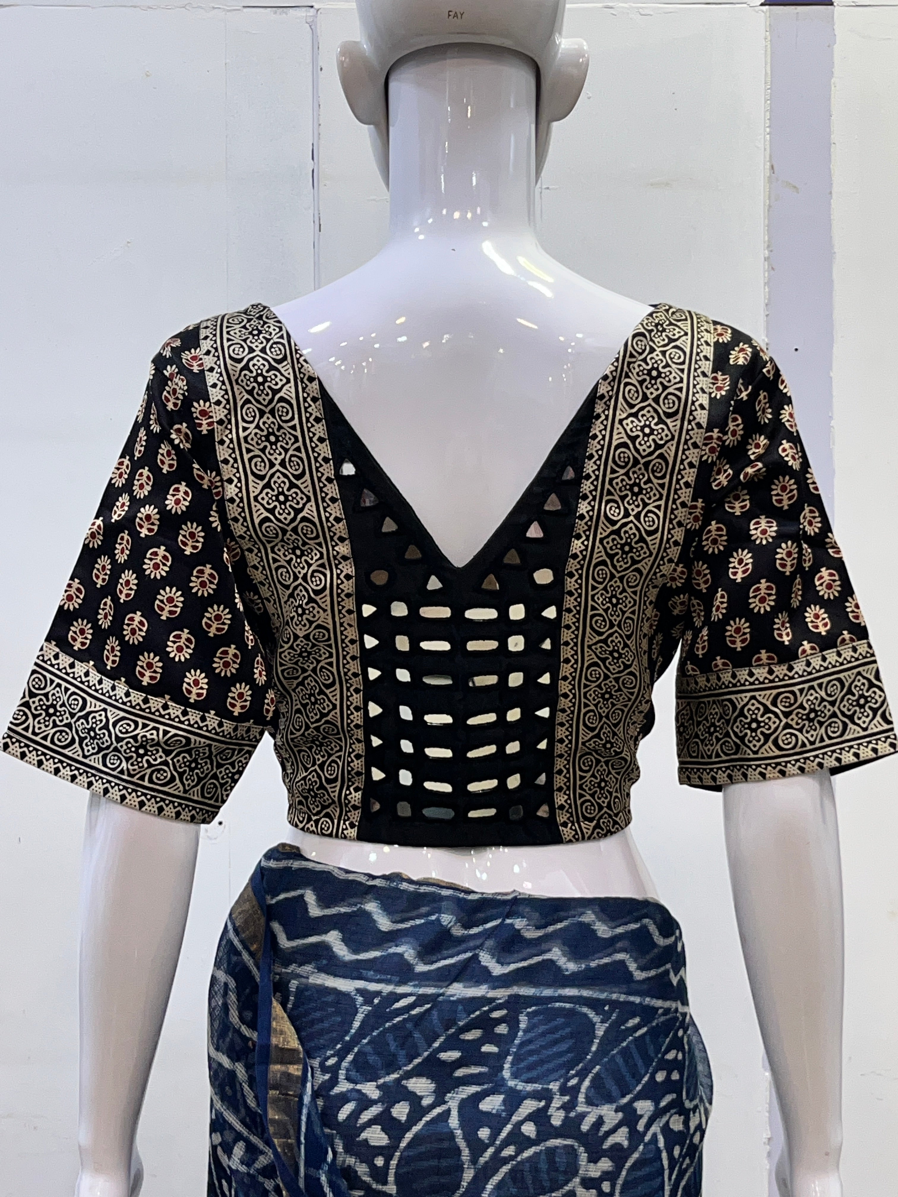 Our exquisite Ajrakh Mashru Silk Mirror Work Blouse, handcrafted by master artisans of Kutch. Made from the luxurious Mashru silk, this blouse combines a smooth, lustrous finish with traditional Ajrakh hand block prints. Intricate mirror work detailing adds a festive sparkle, making it perfect for weddings, celebrations, and premium ethnic styling.