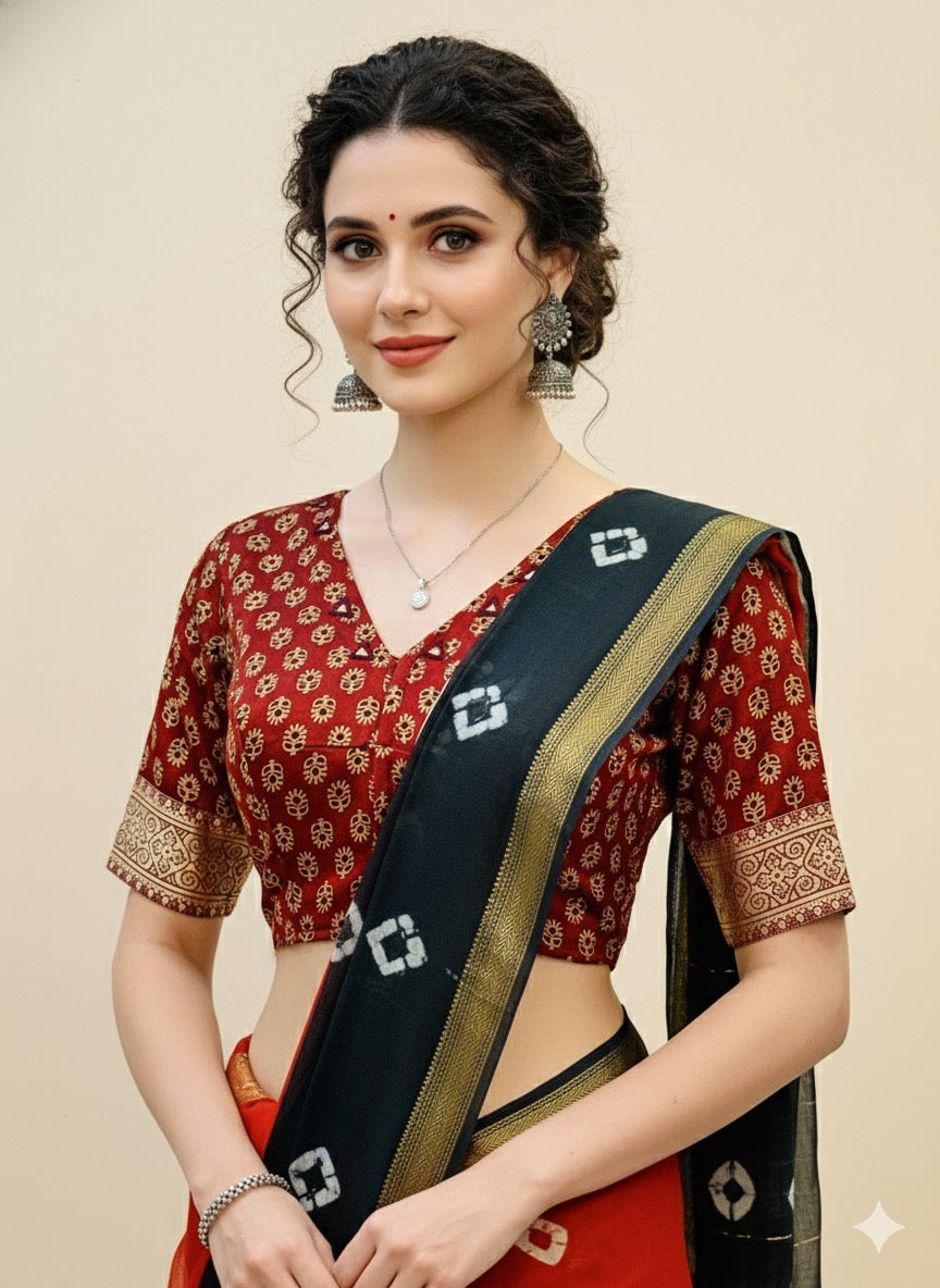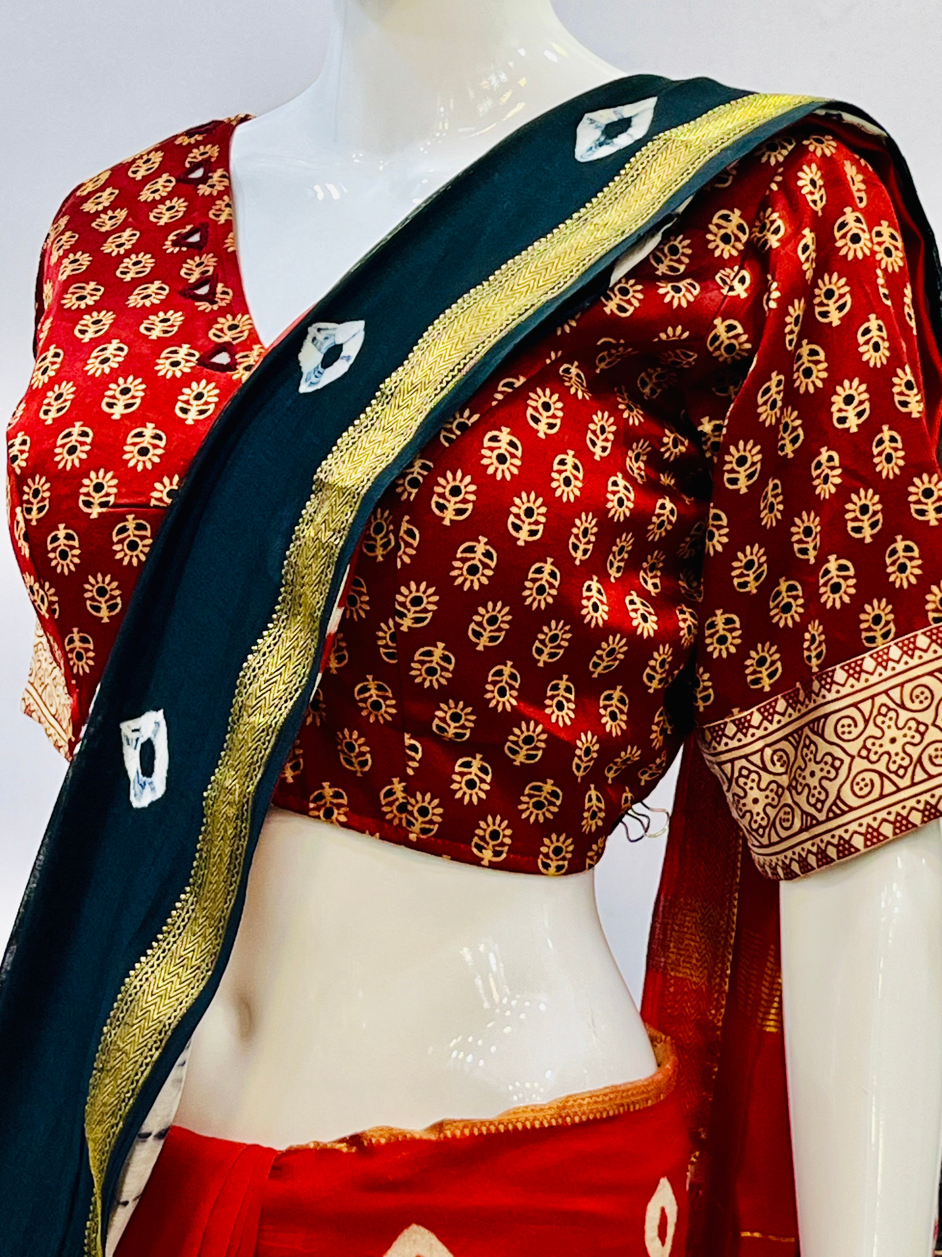 Our exquisite Ajrakh Mashru Silk Mirror Work Blouse, handcrafted by master artisans of Kutch. Made from the luxurious Mashru silk, this blouse combines a smooth, lustrous finish with traditional Ajrakh hand block prints. Intricate mirror work detailing adds a festive sparkle, making it perfect for weddings, celebrations, and premium ethnic styling.