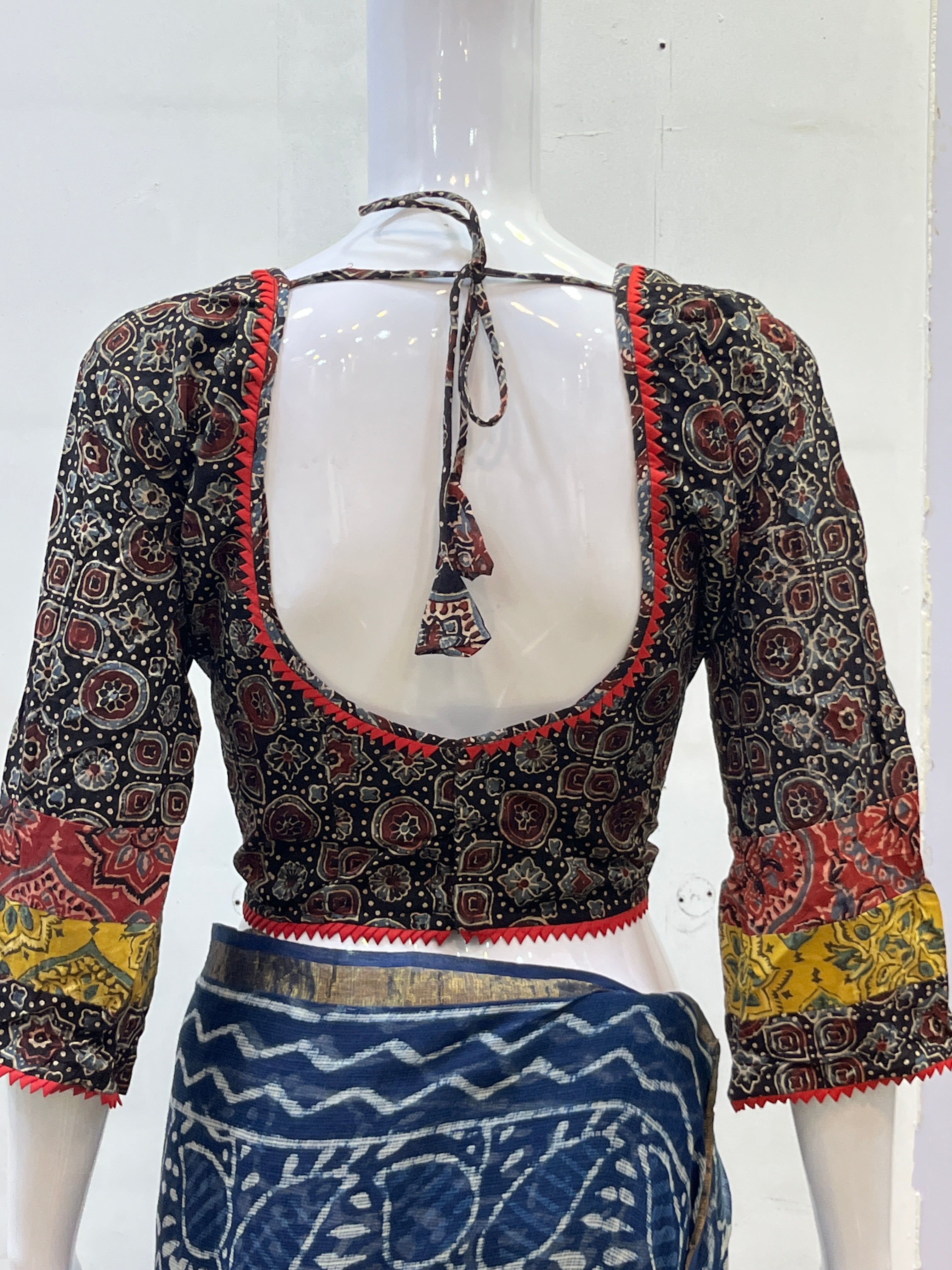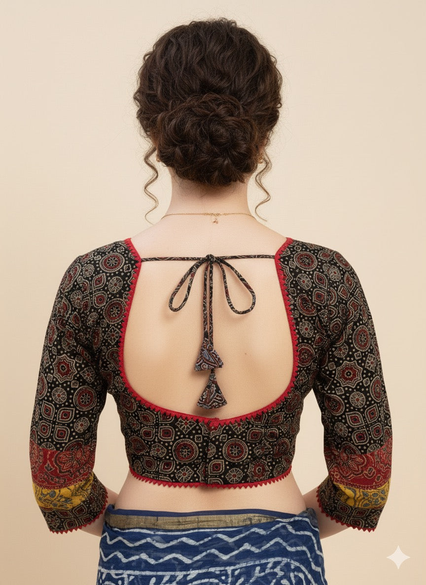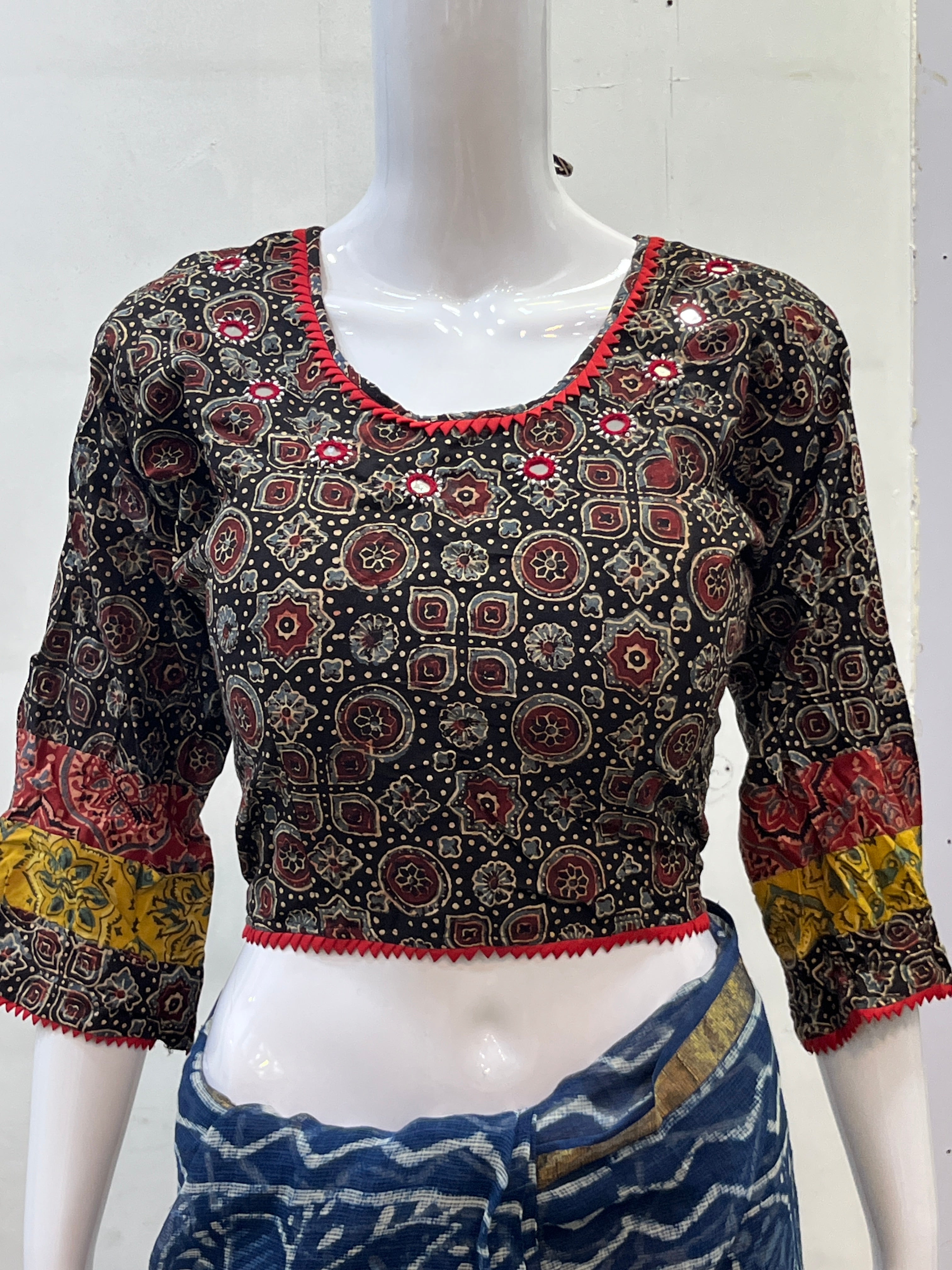 Each piece is adorned with traditional Hand Block prints and mirror work meticulously hand-blocked by skilled artisans, celebrating the heritage of Kutch centuries-old textile art. Whether paired with a saree, skirt, or jeans, these blouses bring a touch of artisanal charm to your everyday wardrobe.