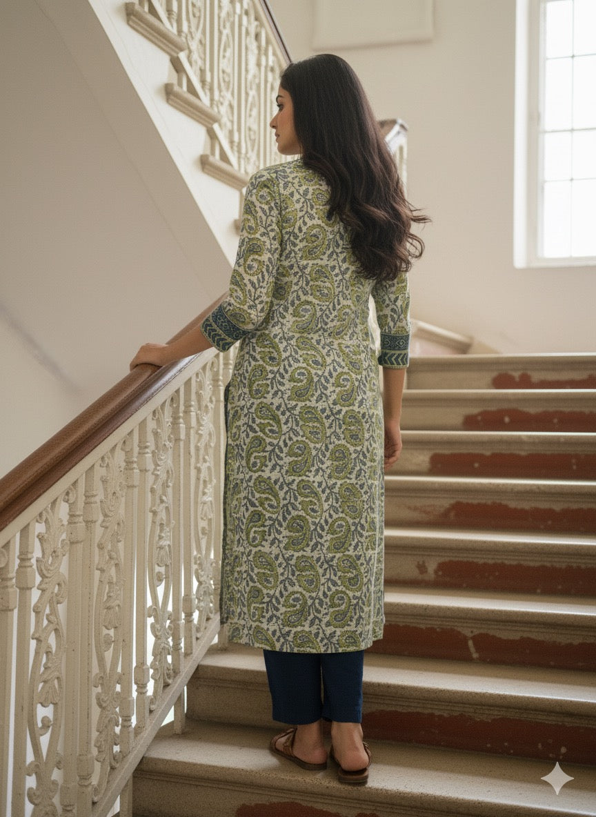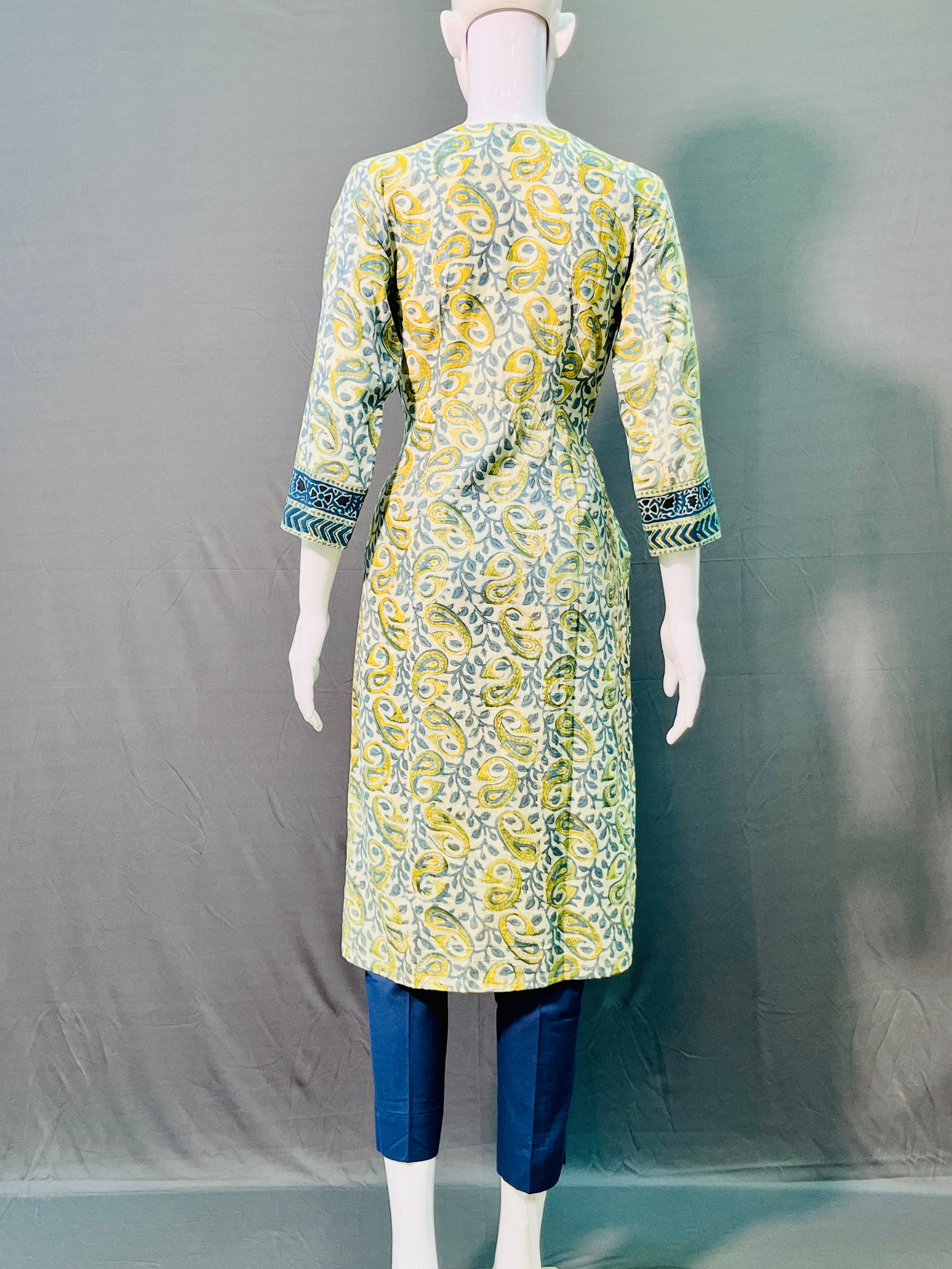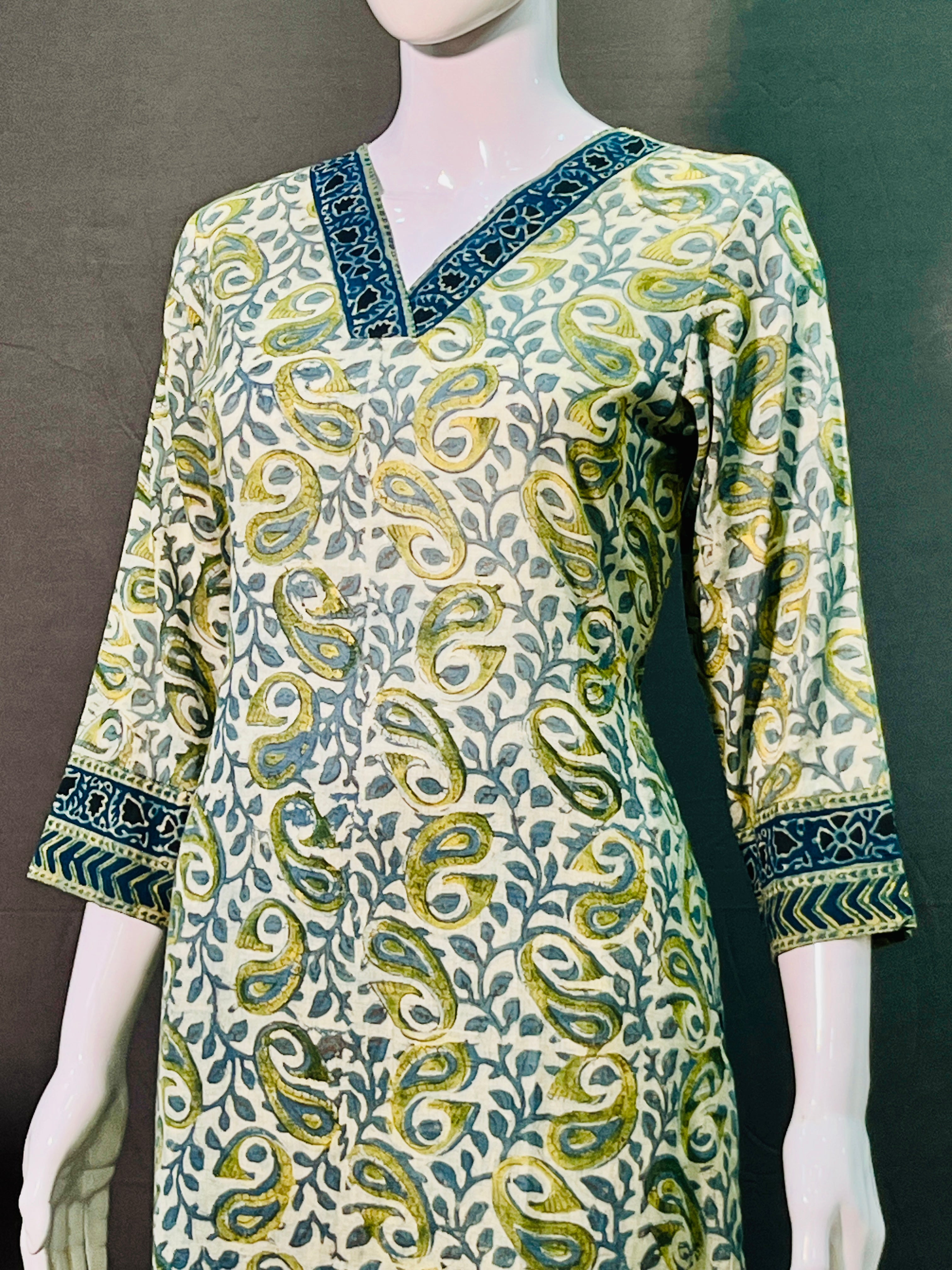 In the artful process of hand block-printing and stitching, variations are likely to come into existence. These irregularities are the hallmark of all handmade products and give each style a unique identity.Colours tend to be perceived differently depending on factors such as shot angles, lighting, background tones and colour temperatures. As a result, prints and colours may vary. Nevertheless, we strive to match the tones as close to the original product colours as possible.
