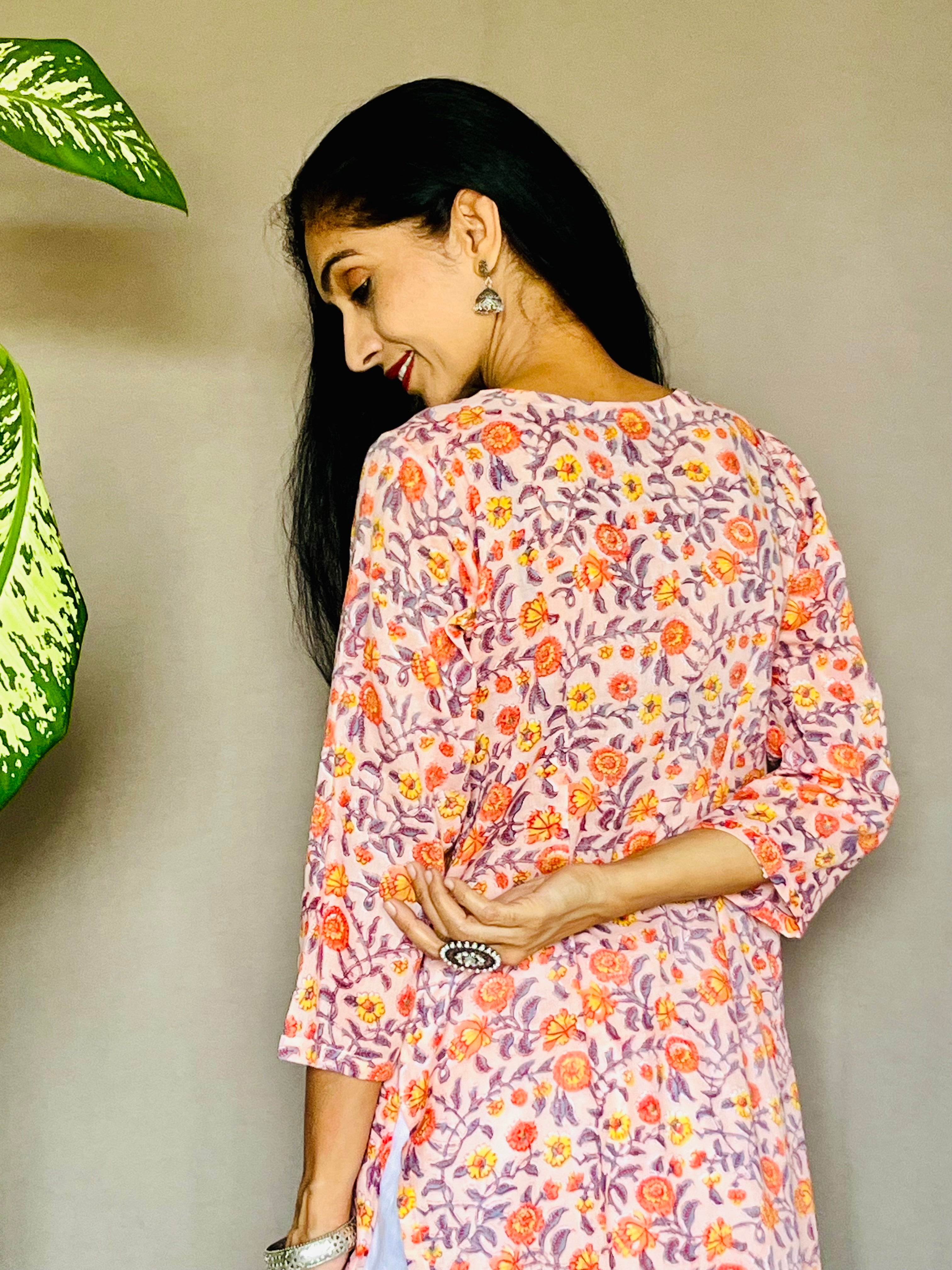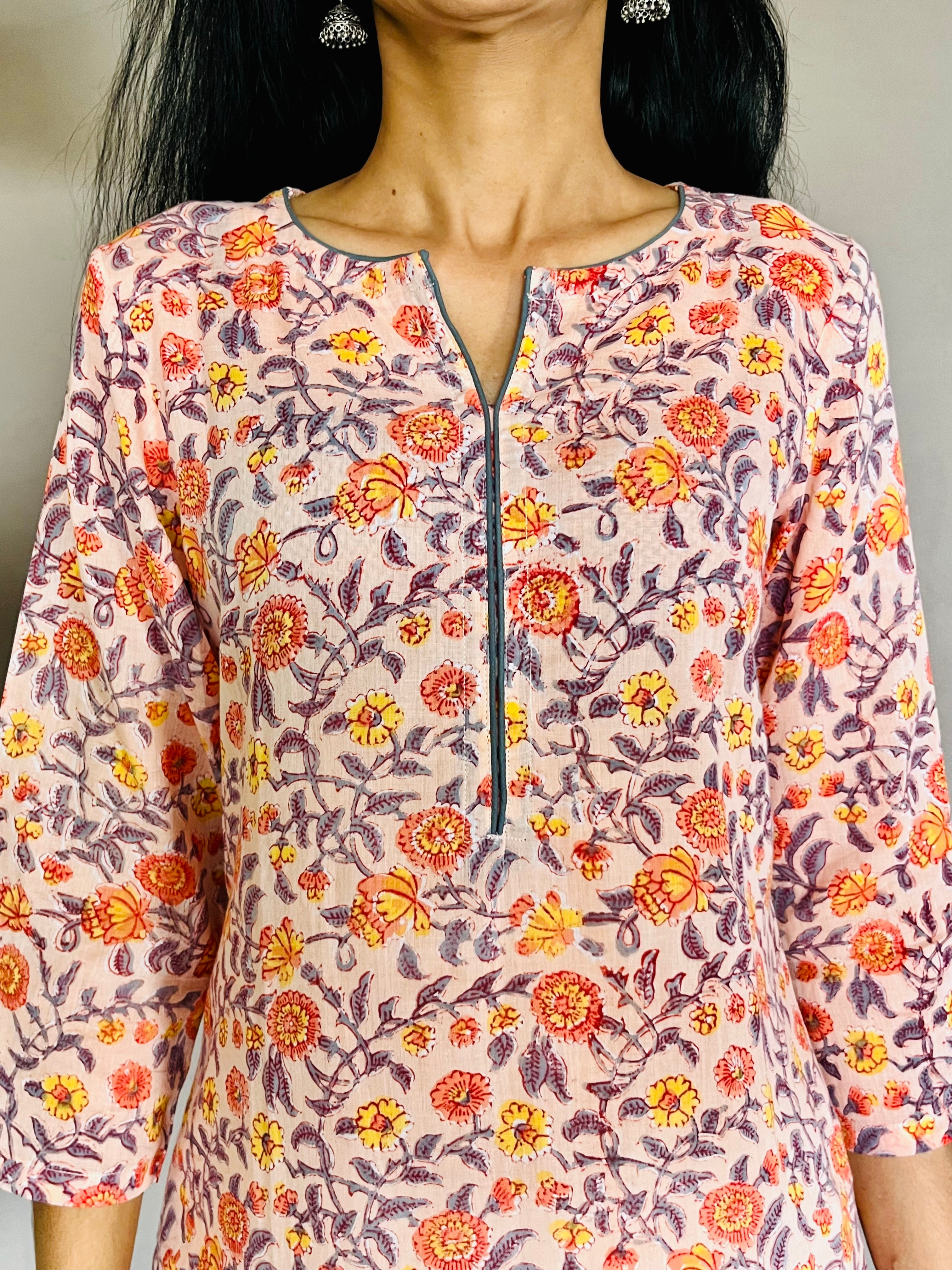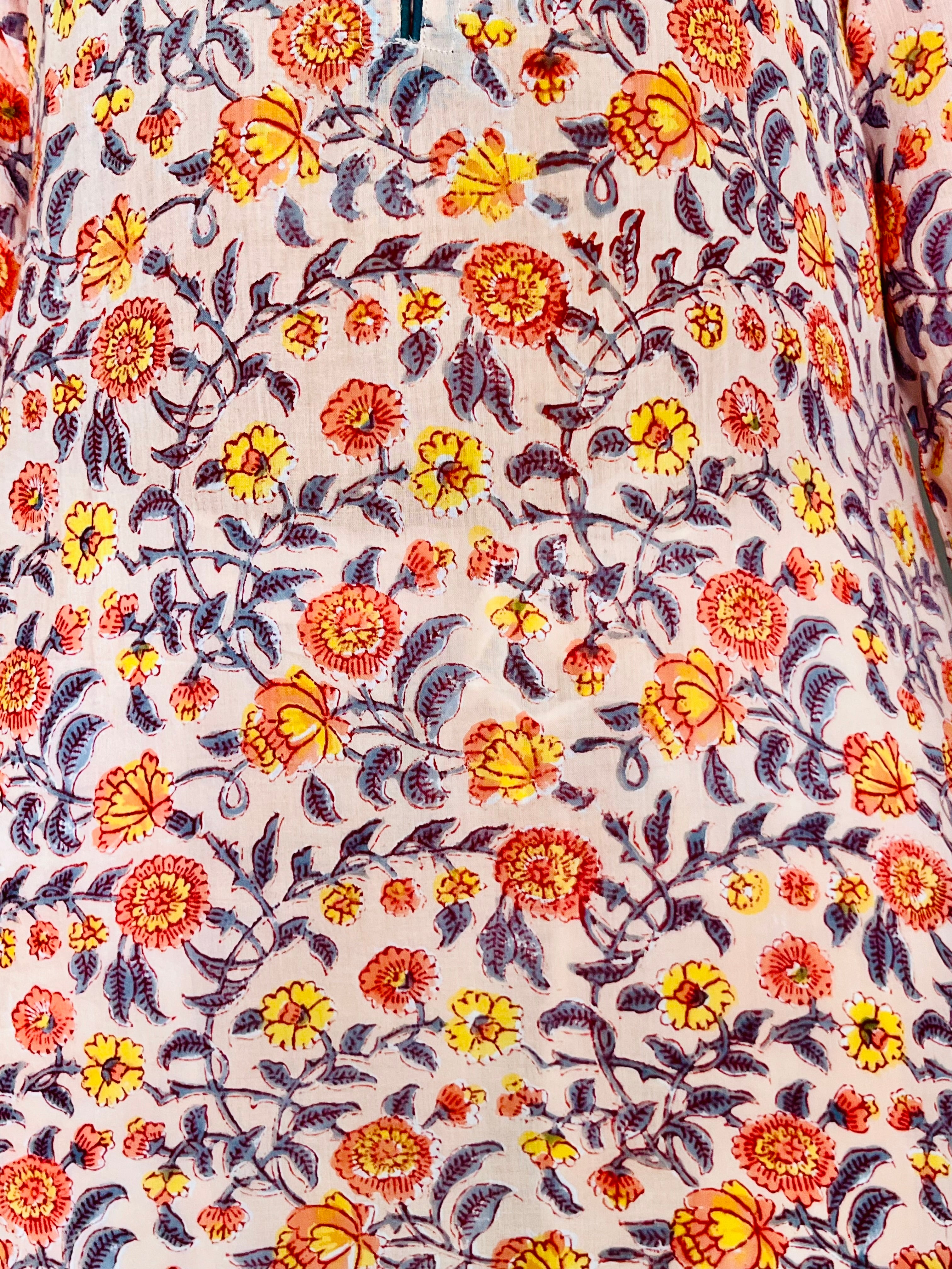 In the artful process of hand block-printing and stitching, variations are likely to come into existence. These irregularities are the hallmark of all handmade products and give each style a unique identity.Colours tend to be perceived differently depending on factors such as shot angles, lighting, background tones and colour temperatures. As a result, prints and colours may vary. Nevertheless, we strive to match the tones as close to the original product colours as possible.