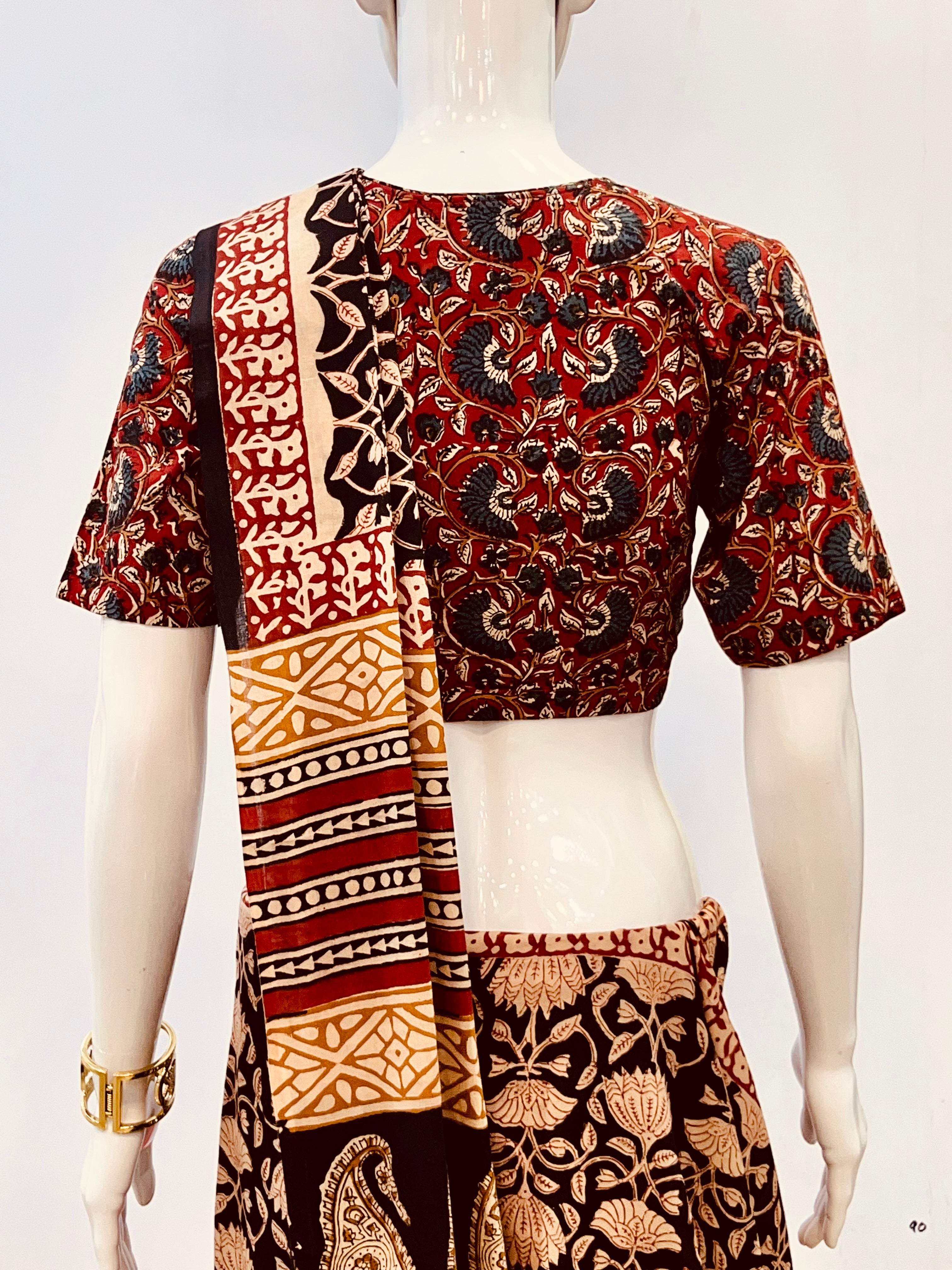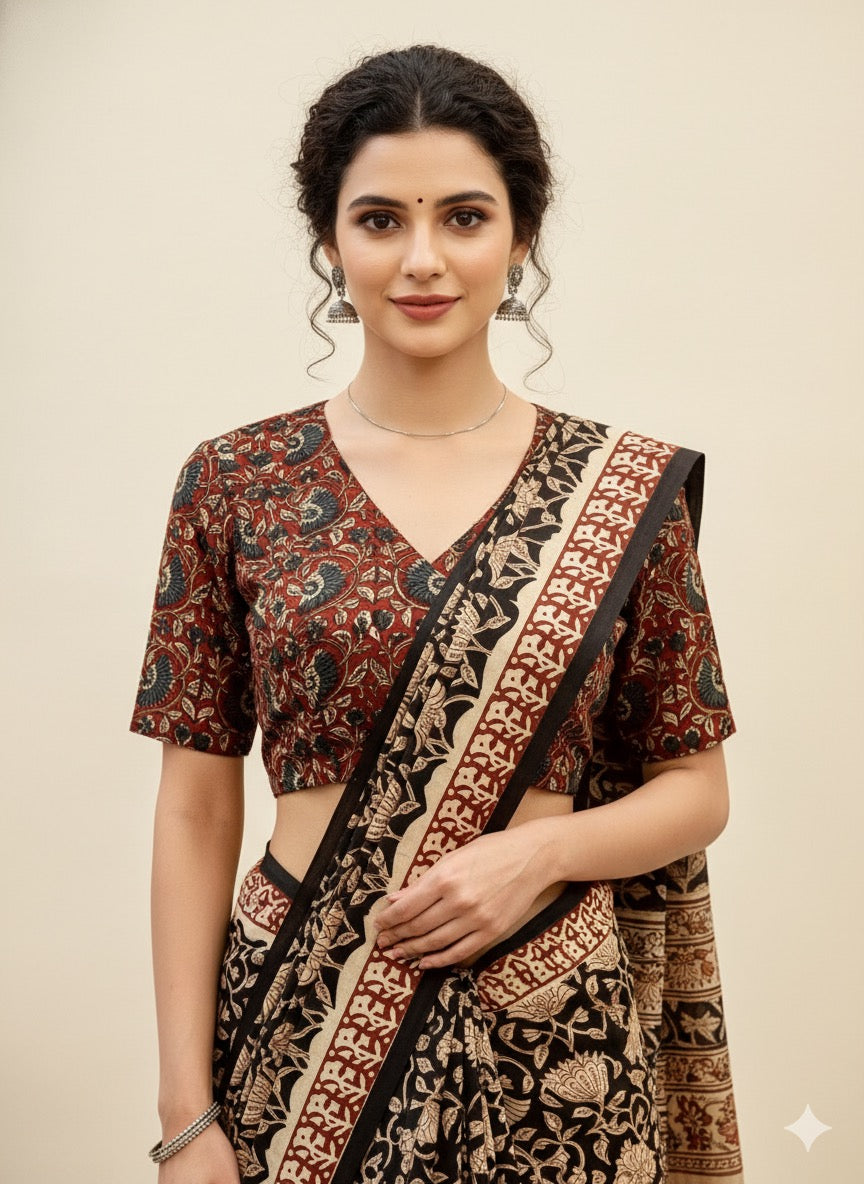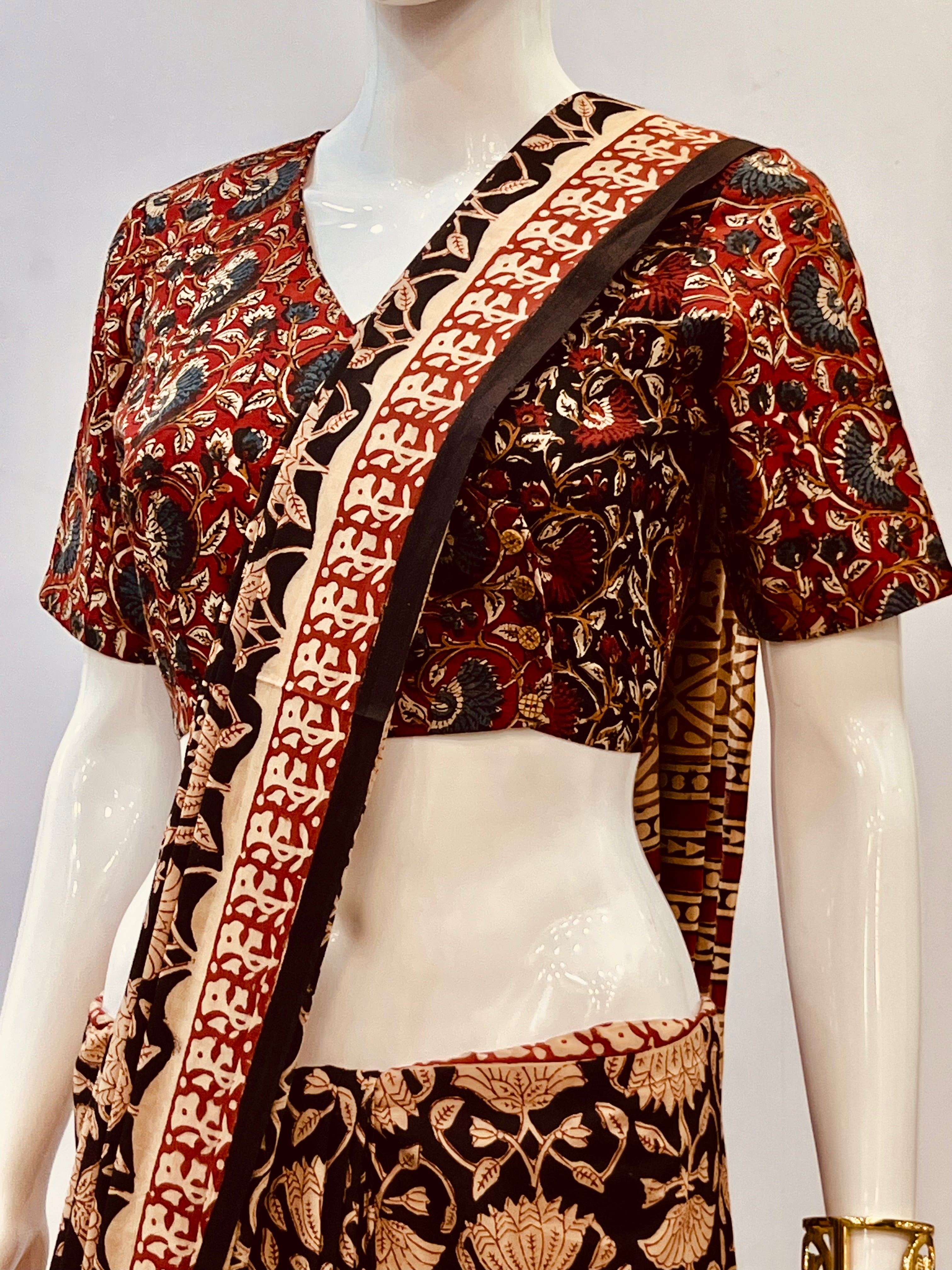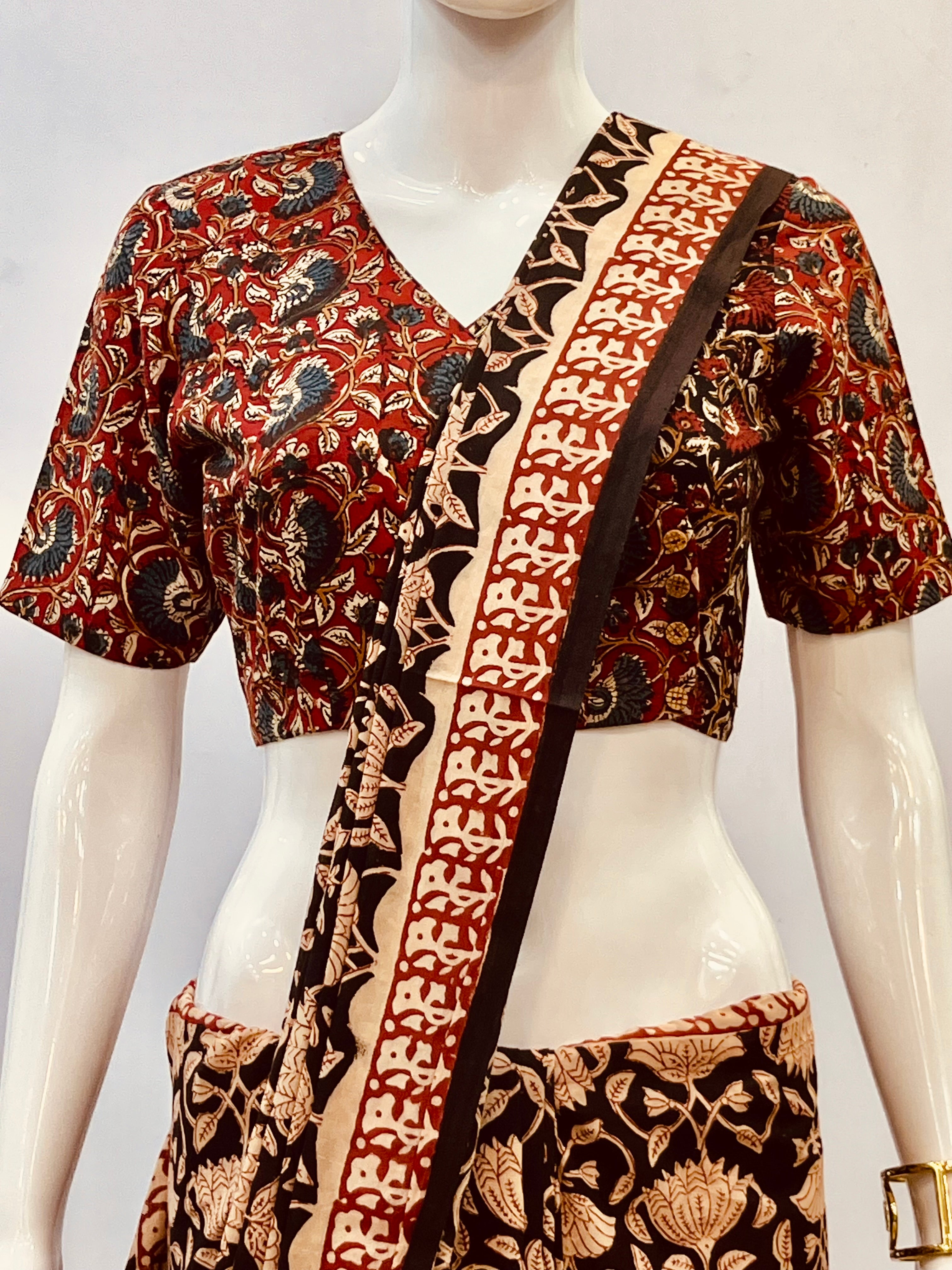 Kalamkari is a type of hand-painted or block-printed cotton textile, produced in parts of India and Iran.  Only natural dyes are used in kalamkari and it involves seventeen steps. One of the most popular natural fibres in the world, cotton is hailed for its beauty, comfort, durability and versatility. Cotton is naturally sustainable and its cultivation supports local farmers and communities. A low maintenance fabric, cotton is also hypoallergenic, making it the perfect choice around the year, especially for the Indian climate.