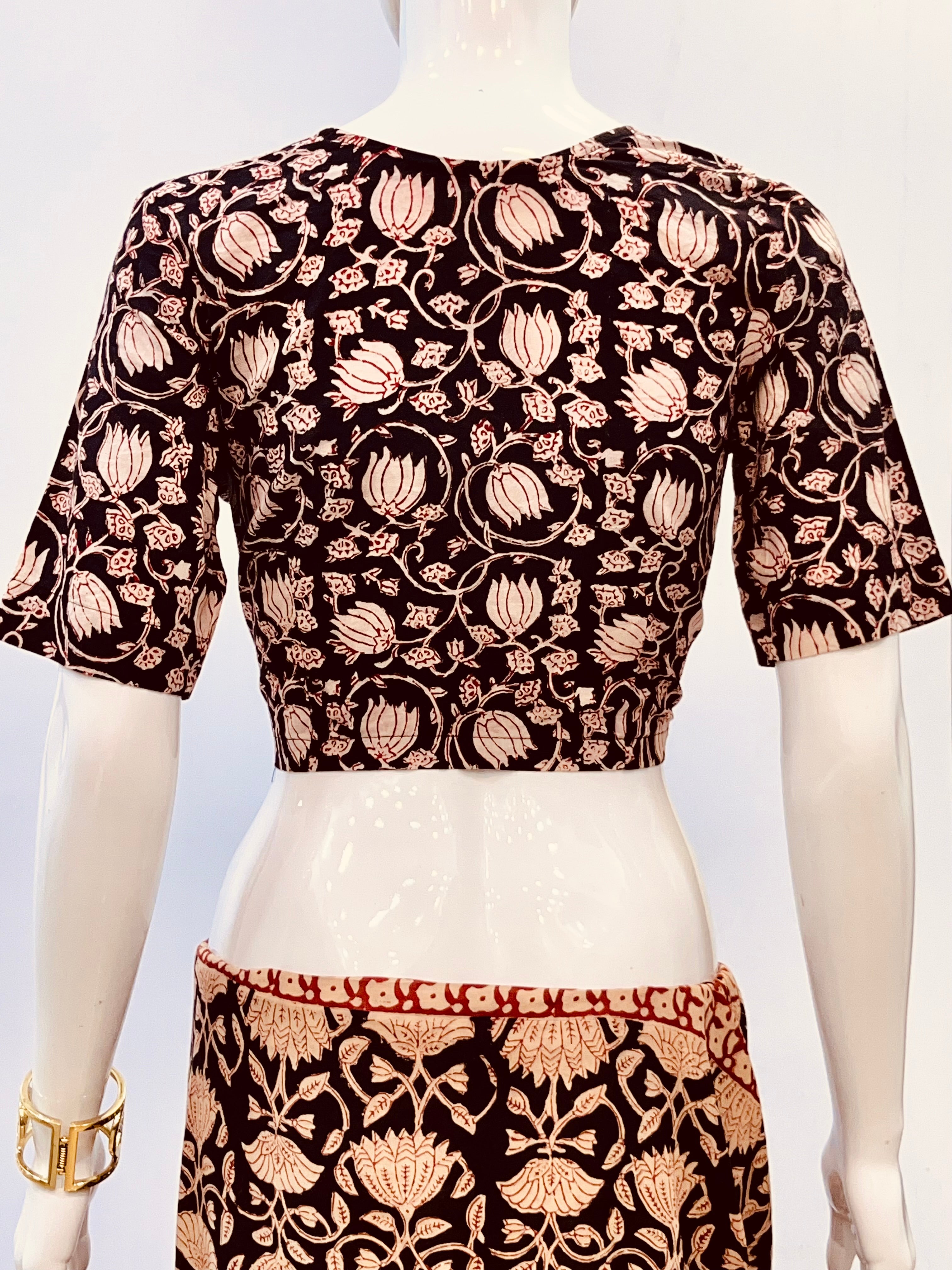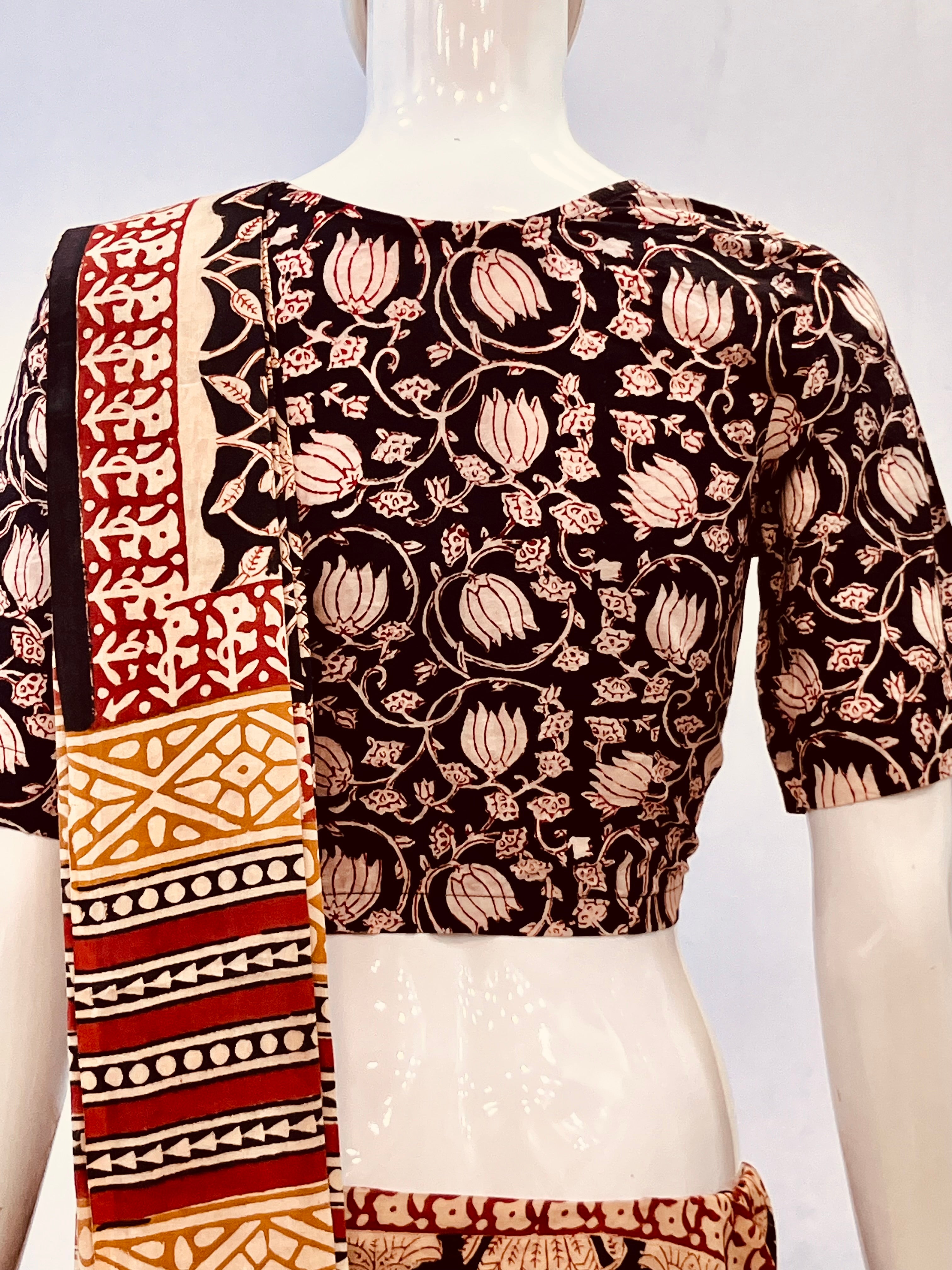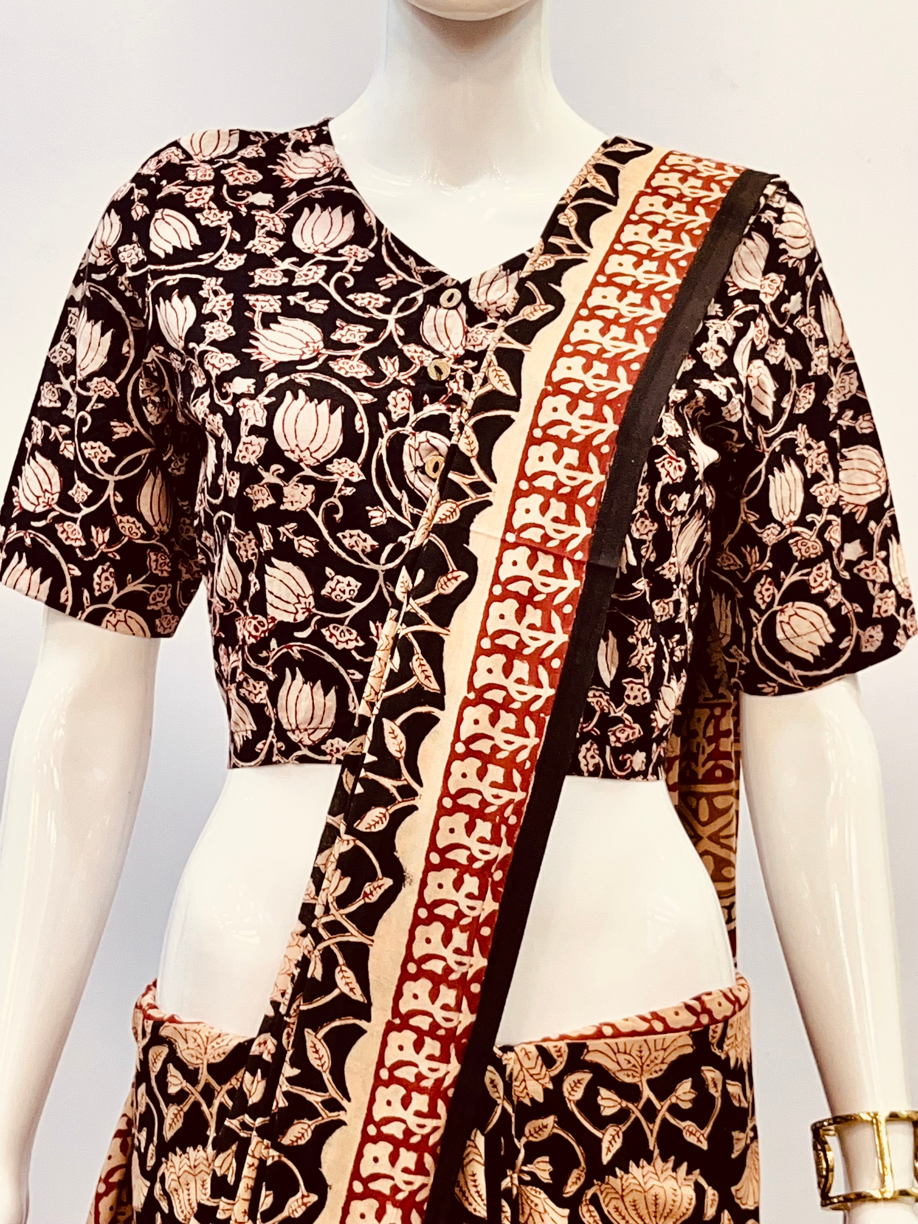 Kalamkari is a type of hand-painted or block-printed cotton textile, produced in parts of India and Iran.  Only natural dyes are used in kalamkari and it involves seventeen steps. One of the most popular natural fibres in the world, cotton is hailed for its beauty, comfort, durability and versatility. Cotton is naturally sustainable and its cultivation supports local farmers and communities. A low maintenance fabric, cotton is also hypoallergenic, making it the perfect choice around the year, especially for the Indian climate.