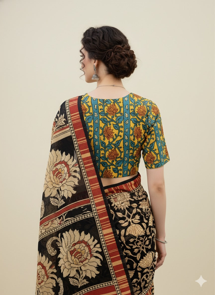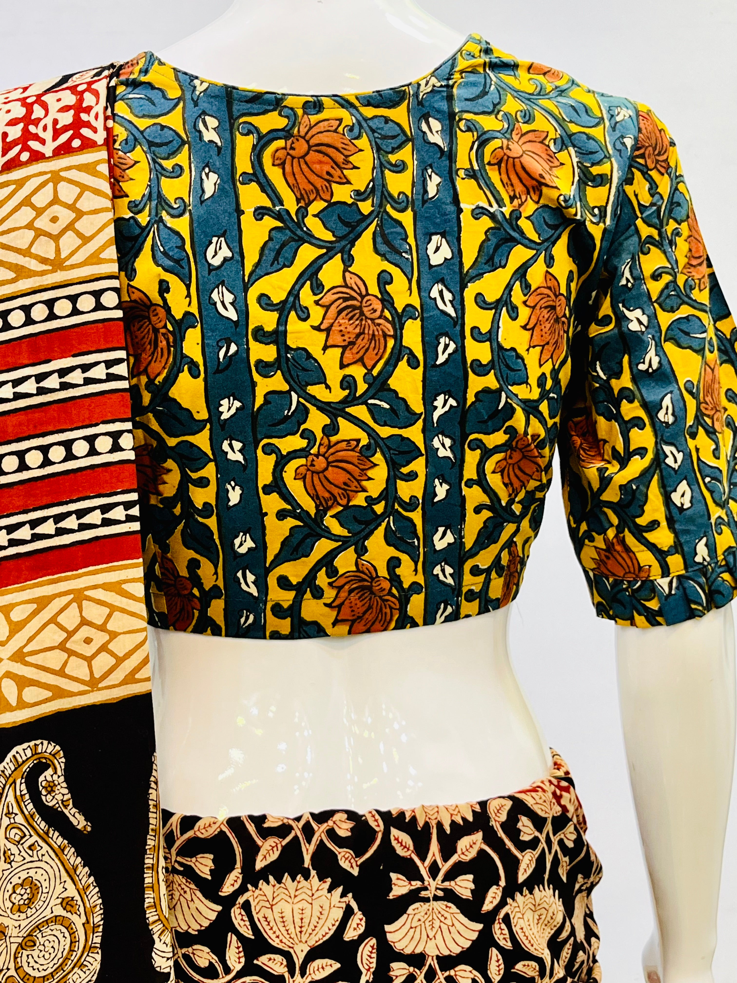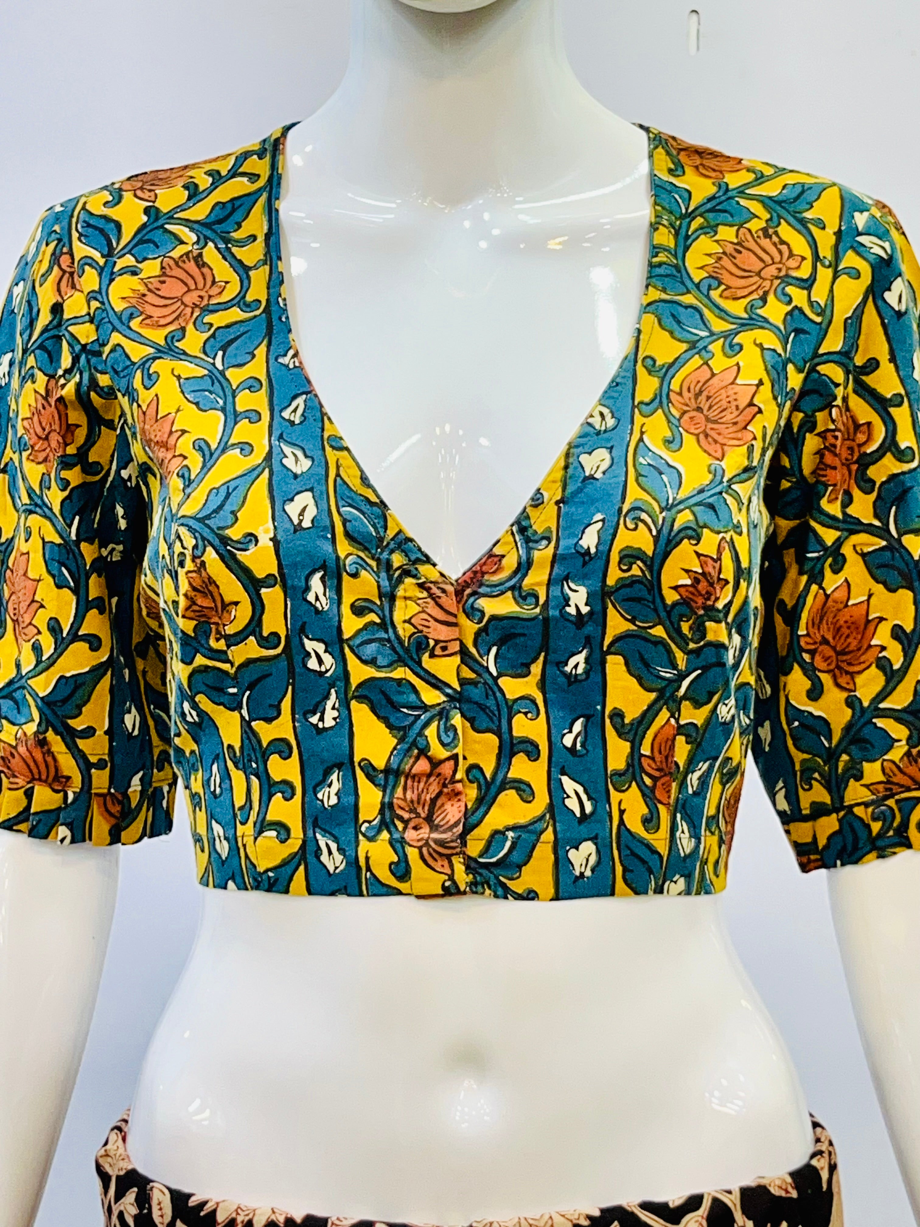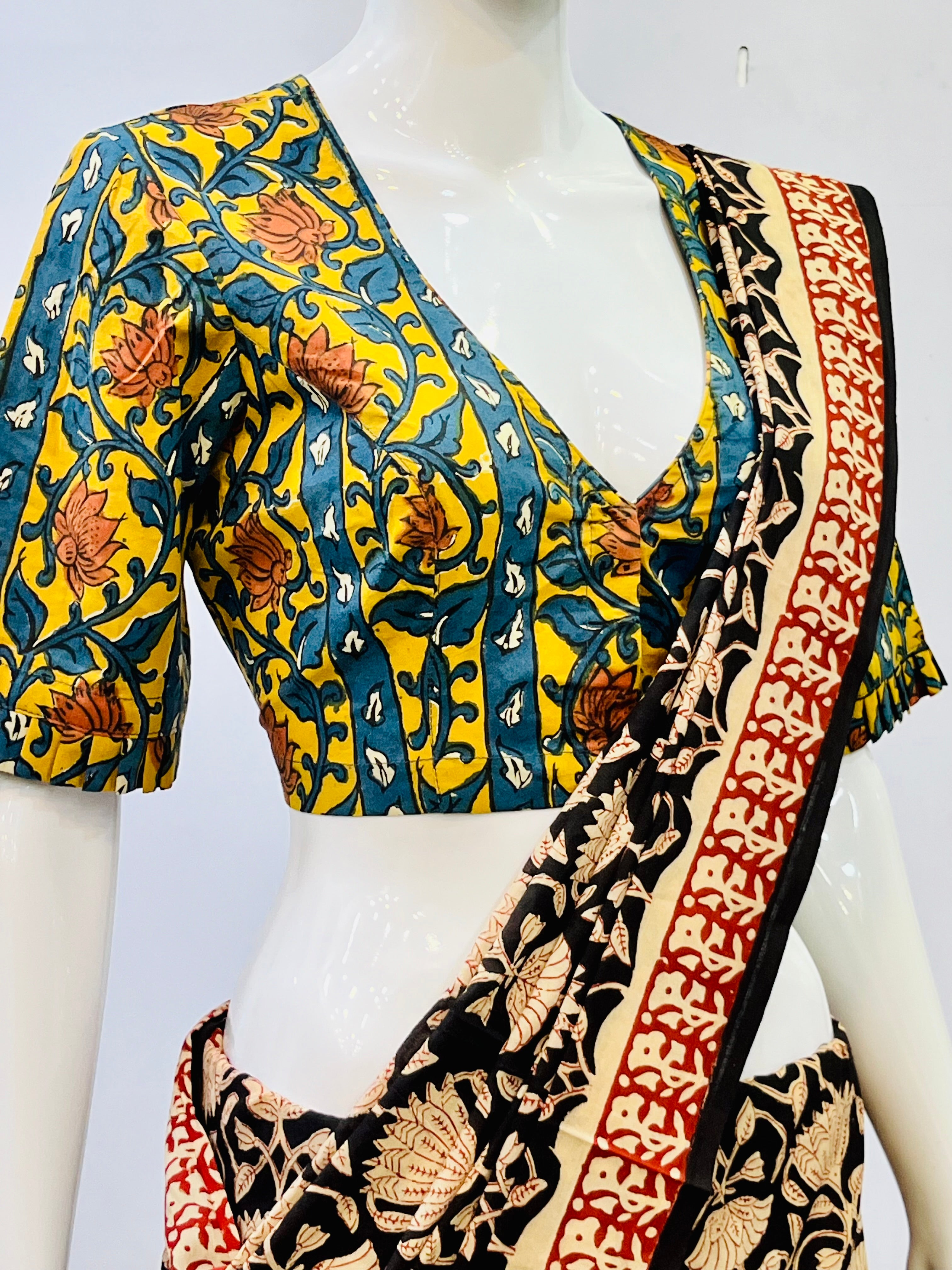 Kalamkari is a type of hand-painted or block-printed cotton textile, produced in parts of India and Iran.  Only natural dyes are used in kalamkari and it involves seventeen steps. One of the most popular natural fibres in the world, cotton is hailed for its beauty, comfort, durability and versatility. Cotton is naturally sustainable and its cultivation supports local farmers and communities. A low maintenance fabric, cotton is also hypoallergenic, making it the perfect choice around the year, especially for the Indian climate.