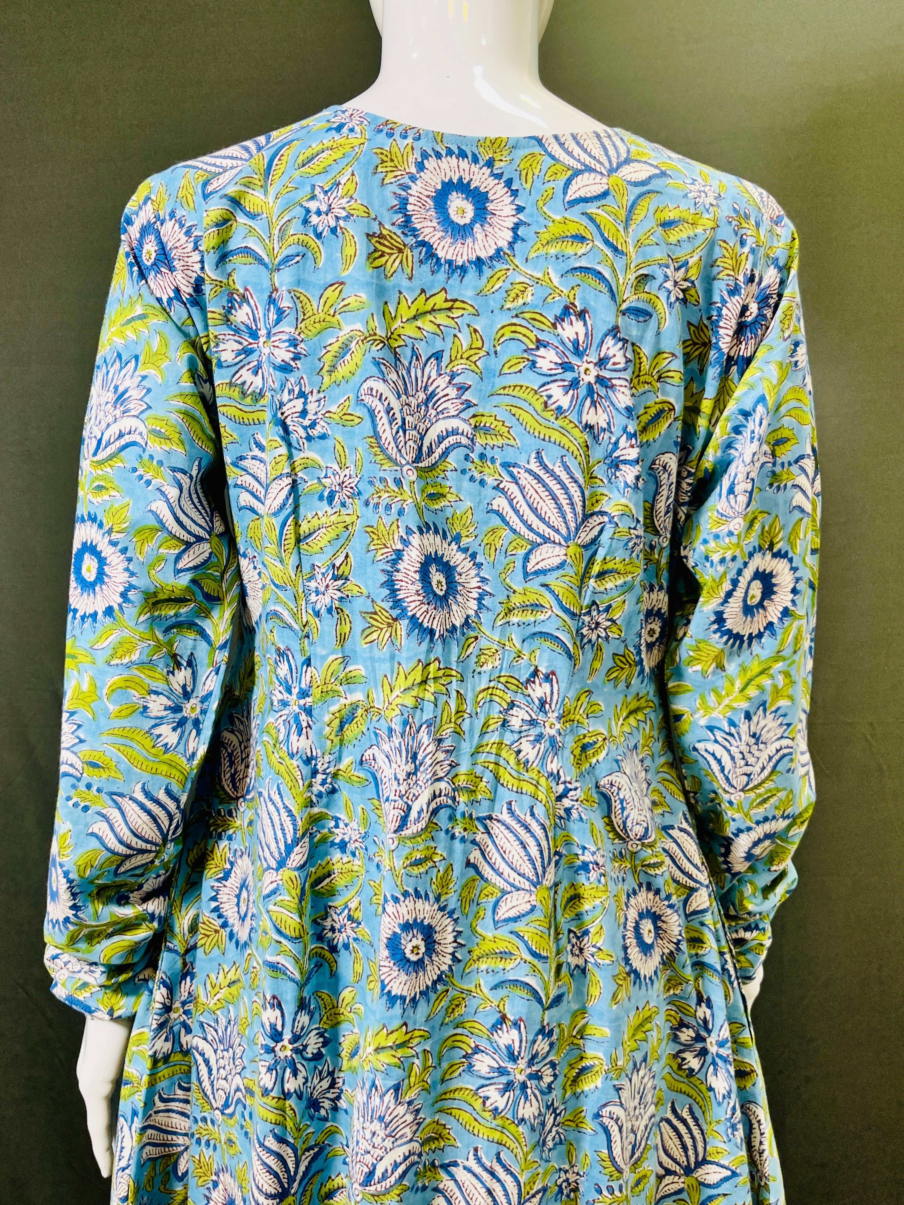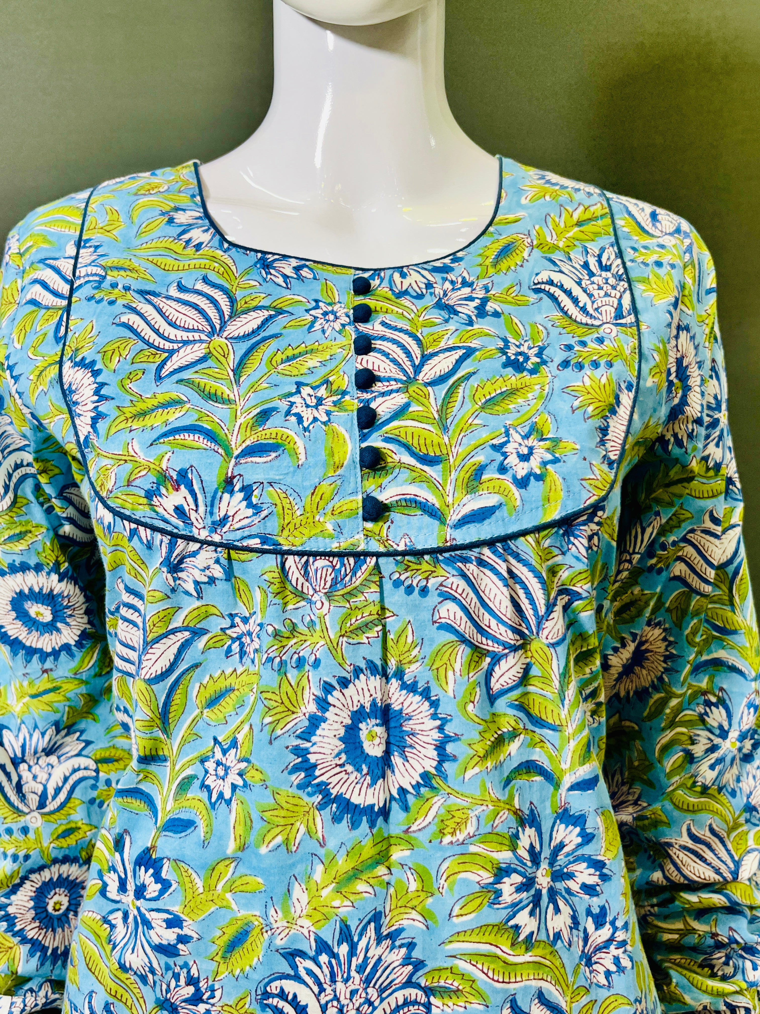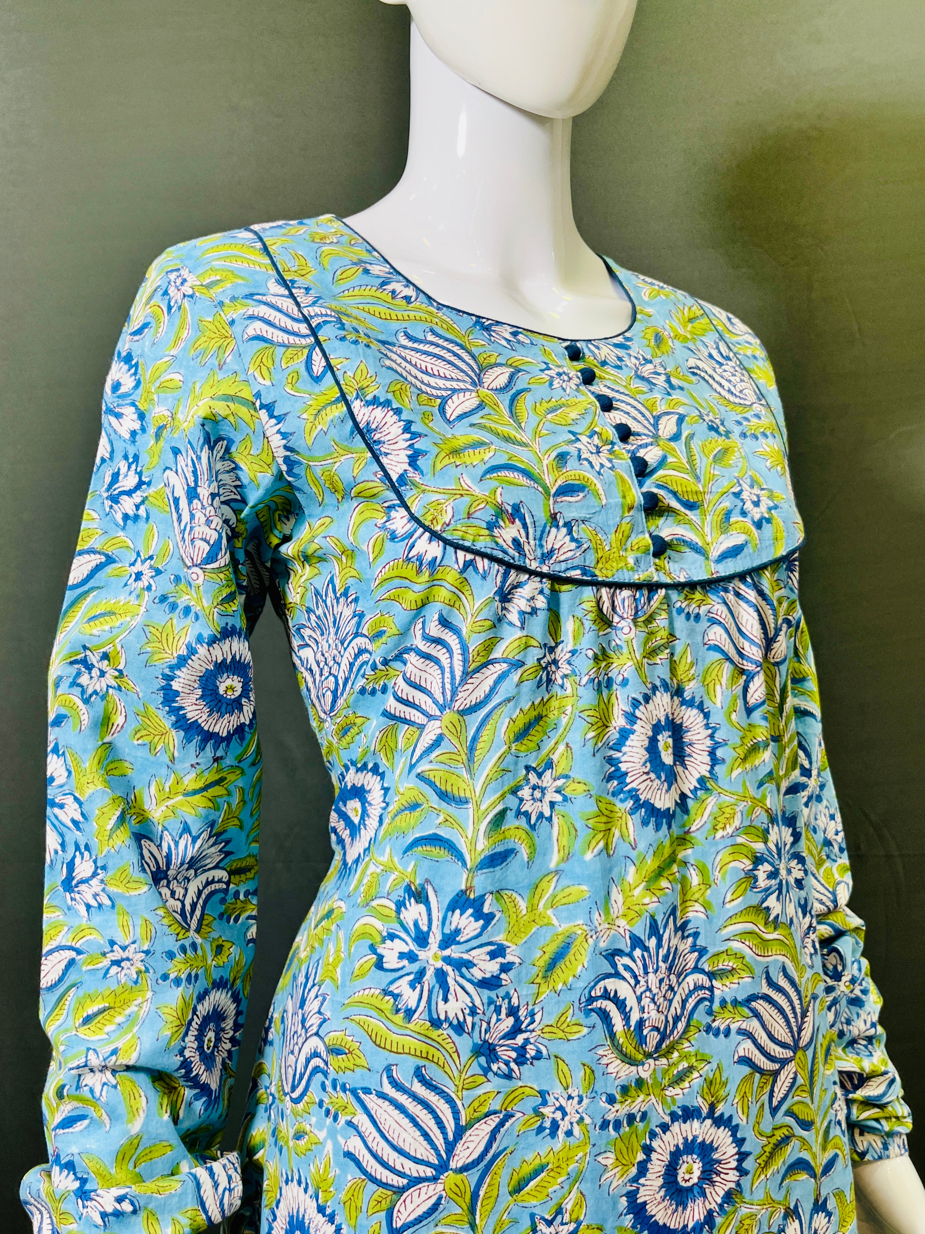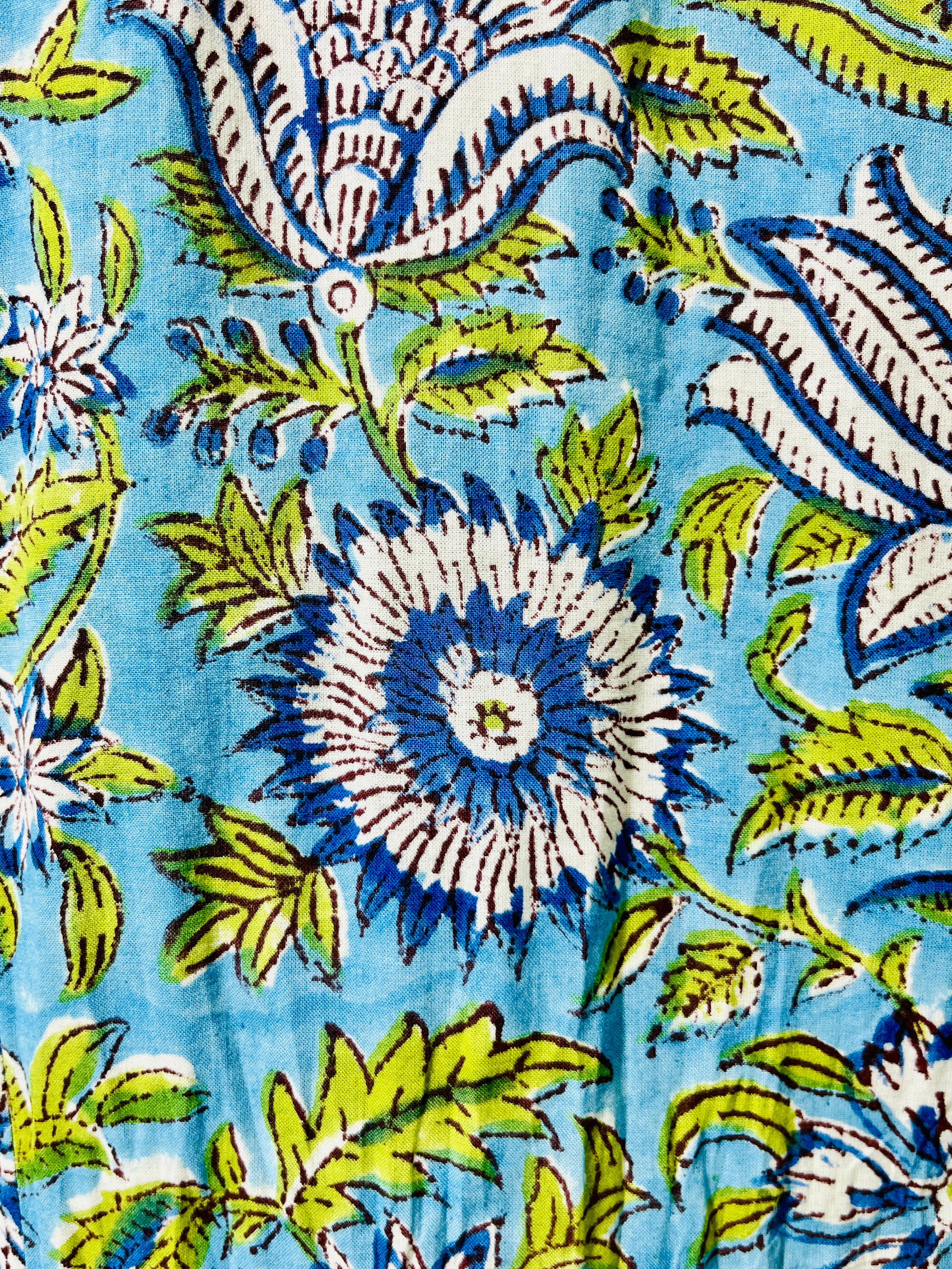 In the artful process of hand block-printing and stitching, variations are likely to come into existence. These irregularities are the hallmark of all handmade products and give each style a unique identity.Colours tend to be perceived differently depending on factors such as shot angles, lighting, background tones and colour temperatures. As a result, prints and colours may vary. Nevertheless, we strive to match the tones as close to the original product colours as possible.
