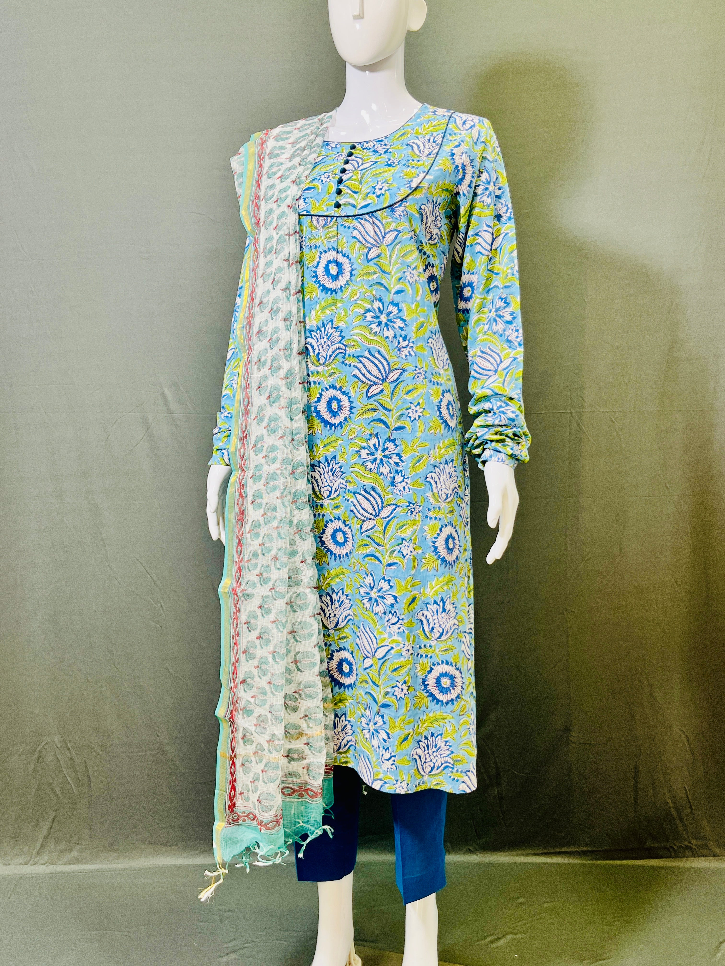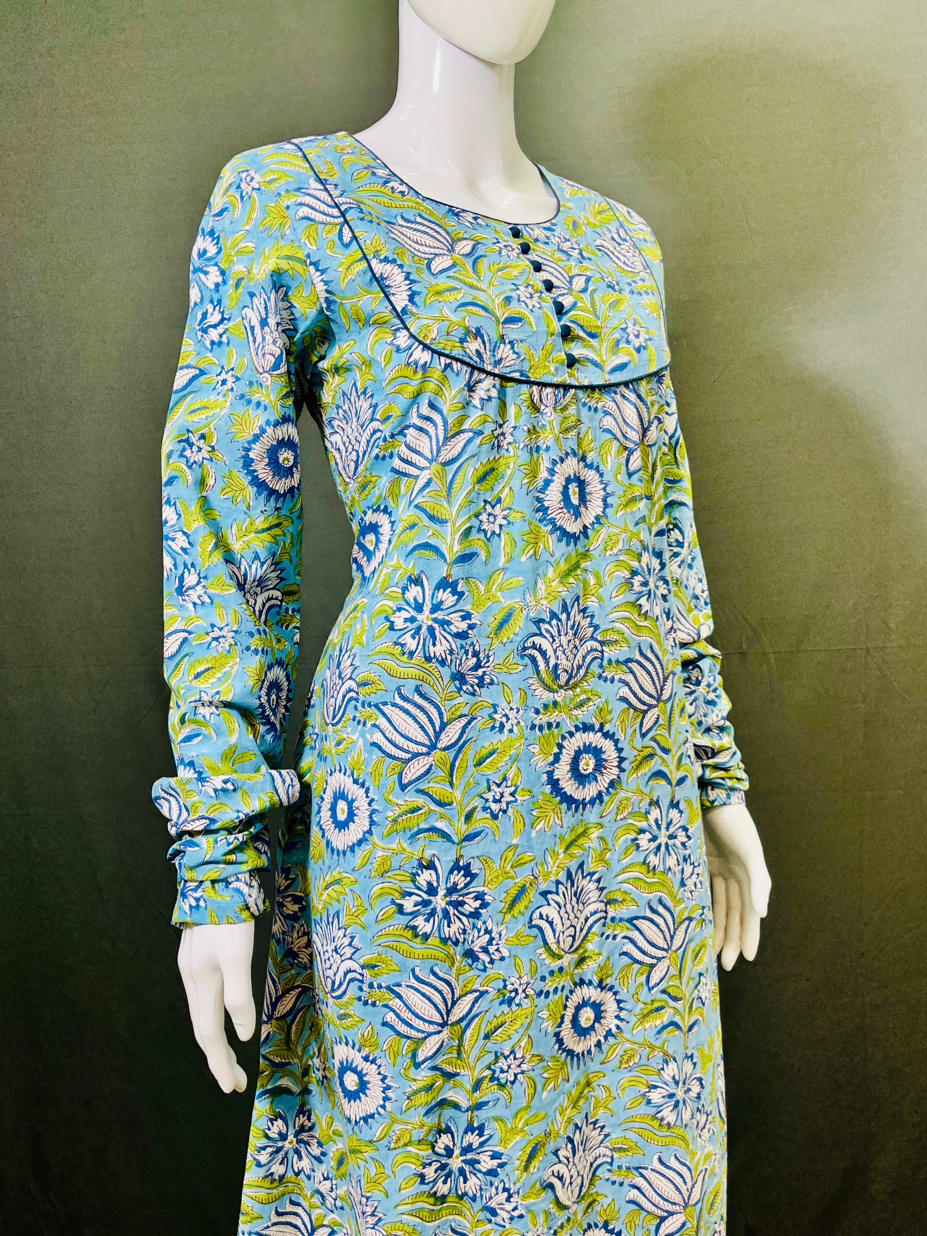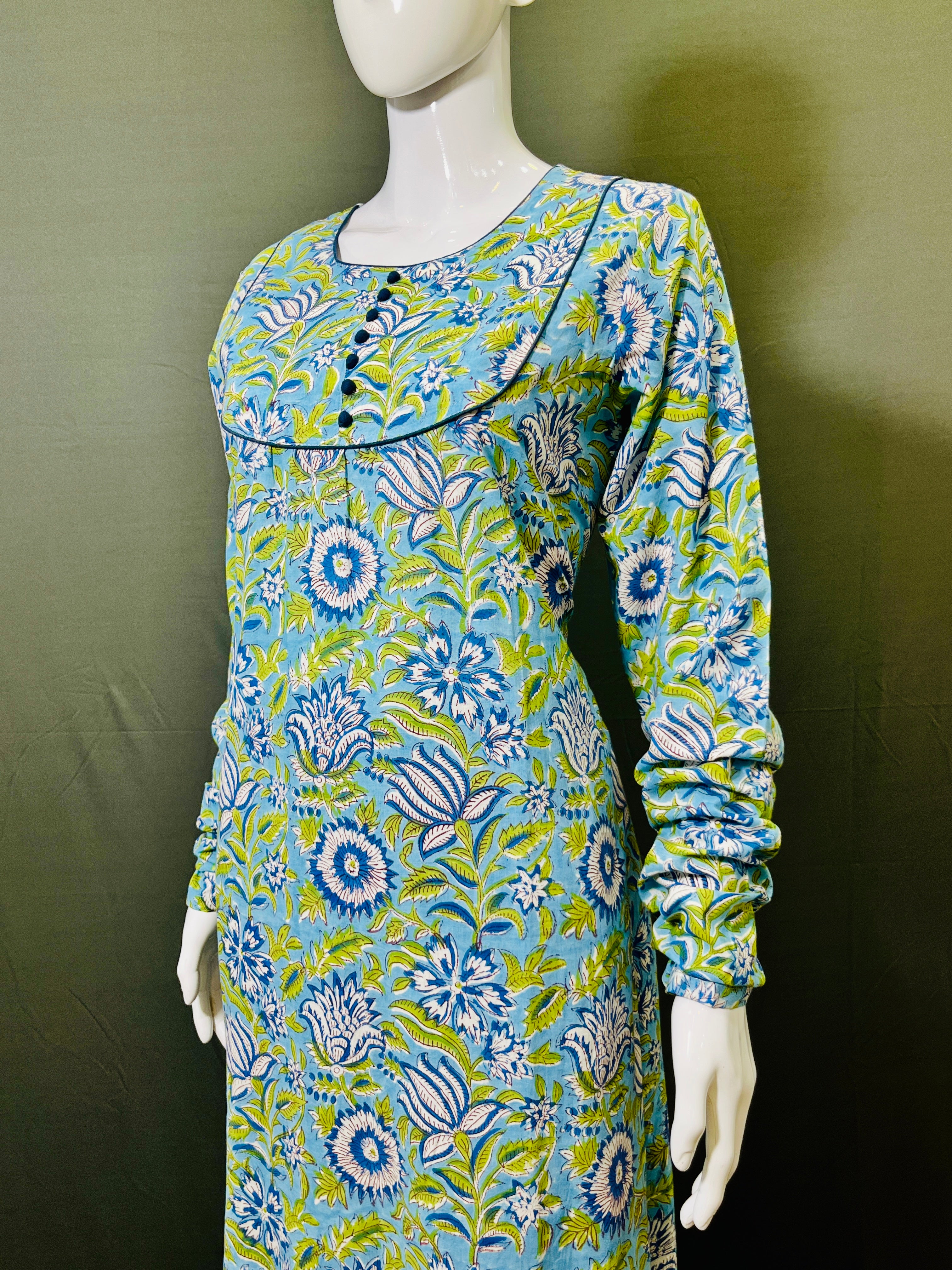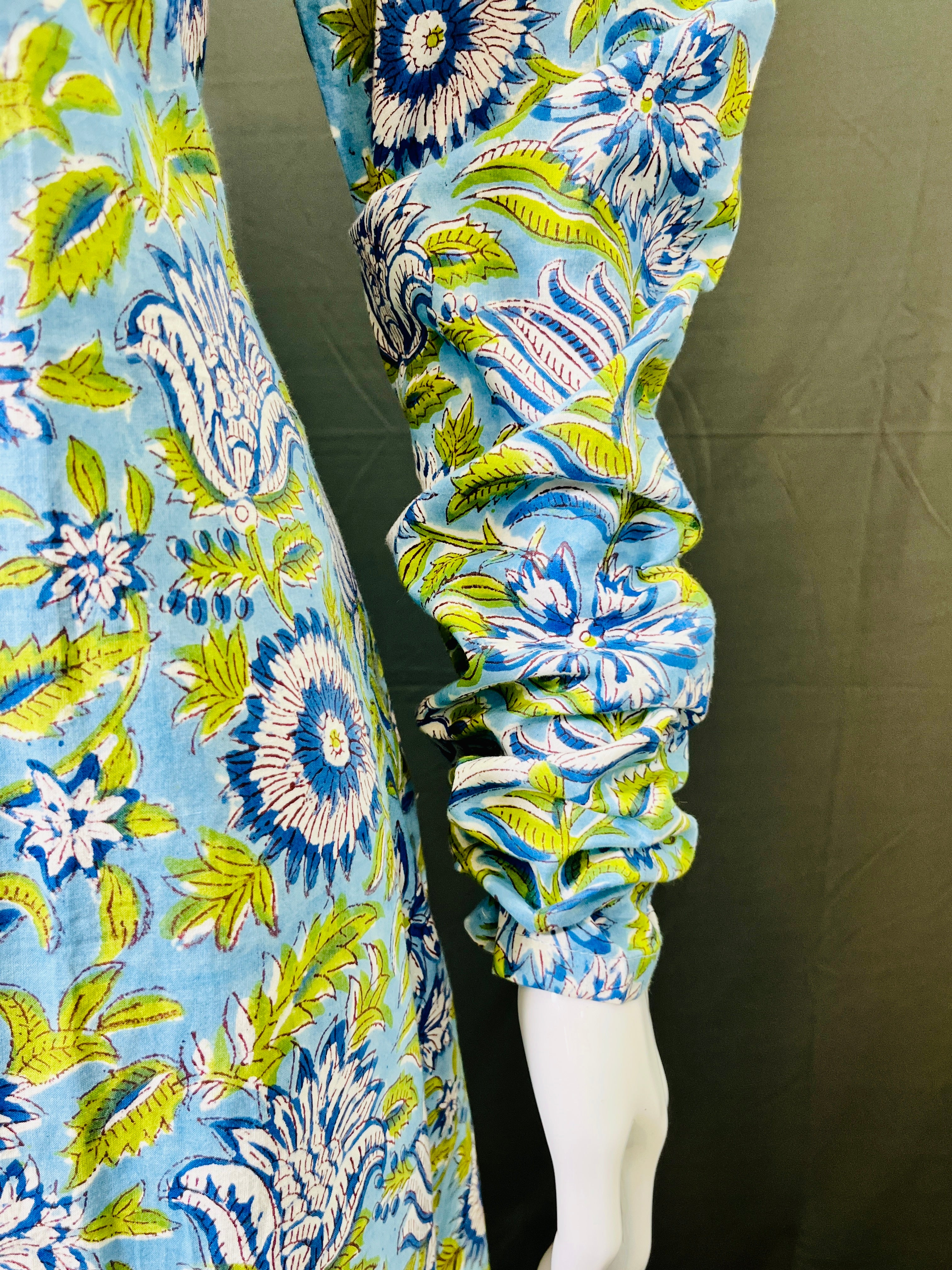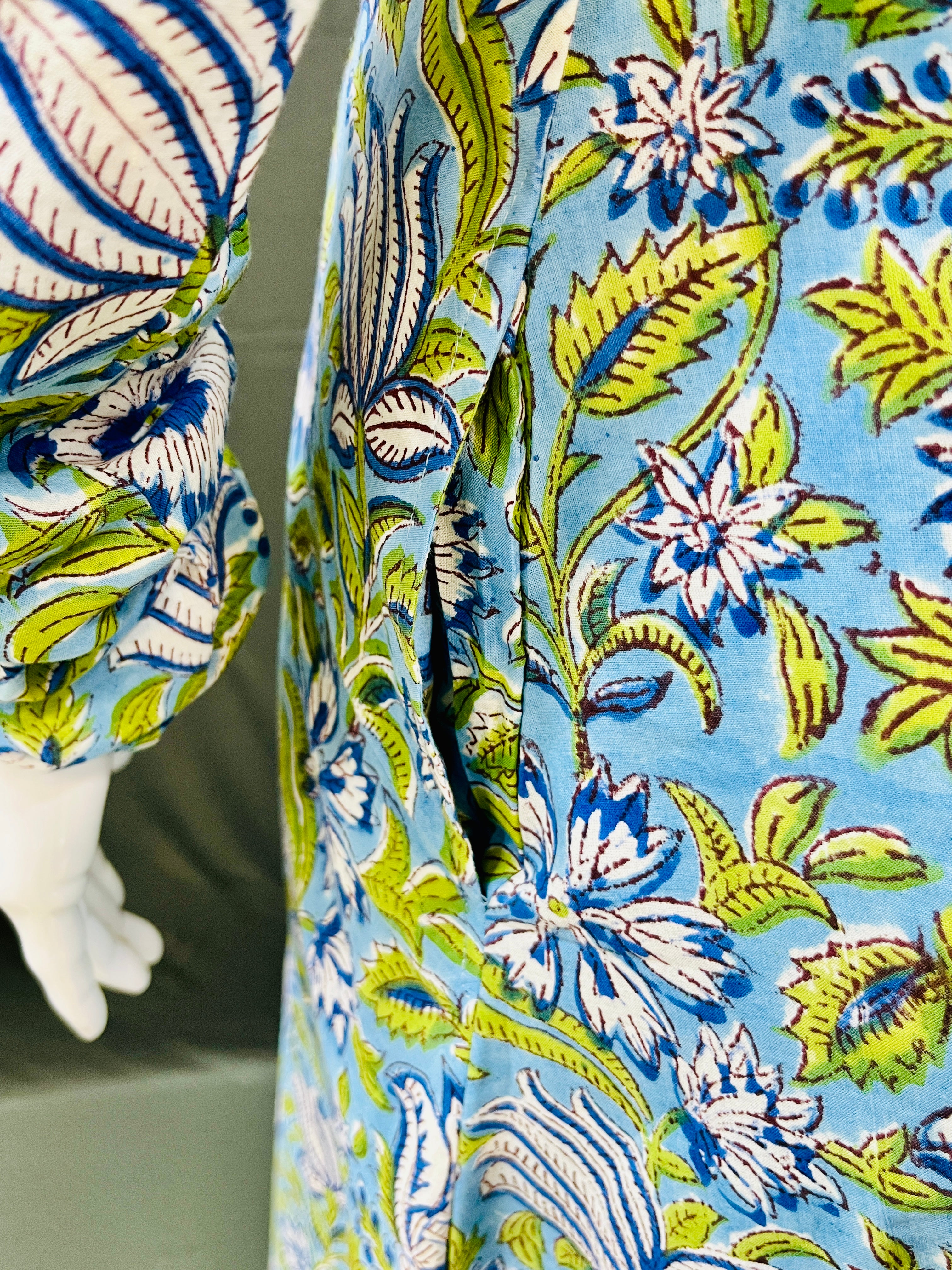 In the artful process of hand block-printing and stitching, variations are likely to come into existence. These irregularities are the hallmark of all handmade products and give each style a unique identity.Colours tend to be perceived differently depending on factors such as shot angles, lighting, background tones and colour temperatures. As a result, prints and colours may vary. Nevertheless, we strive to match the tones as close to the original product colours as possible.