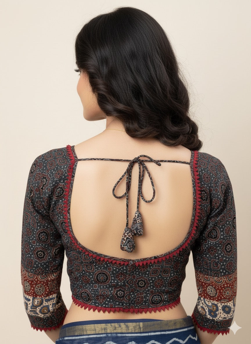 Each piece is adorned with traditional Hand Block prints and mirror work meticulously hand-blocked by skilled artisans, celebrating the heritage of Kutch centuries-old textile art. Whether paired with a saree, skirt, or jeans, these blouses bring a touch of artisanal charm to your everyday wardrobe.