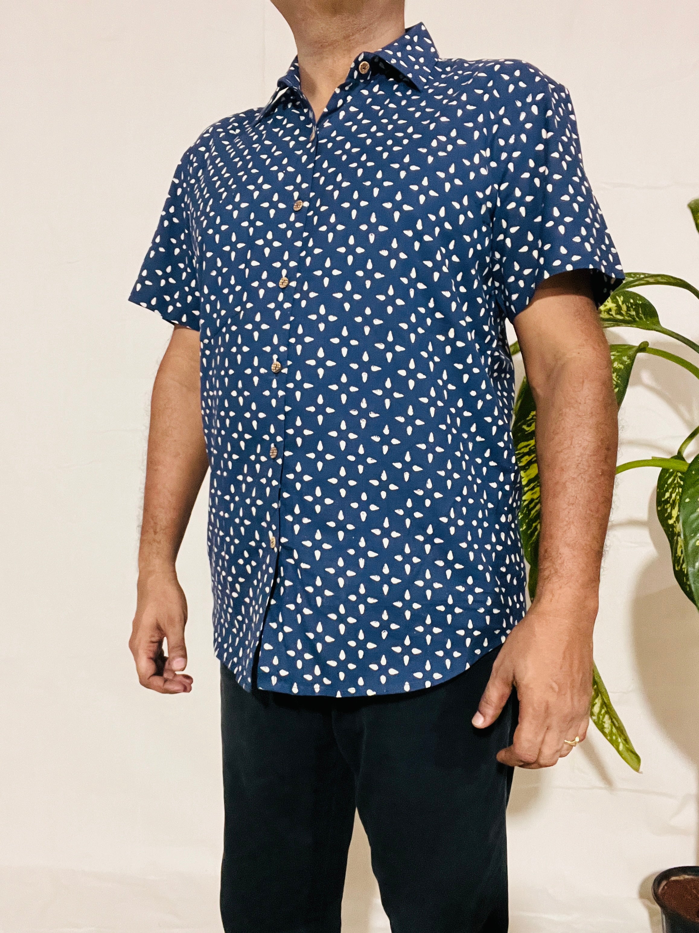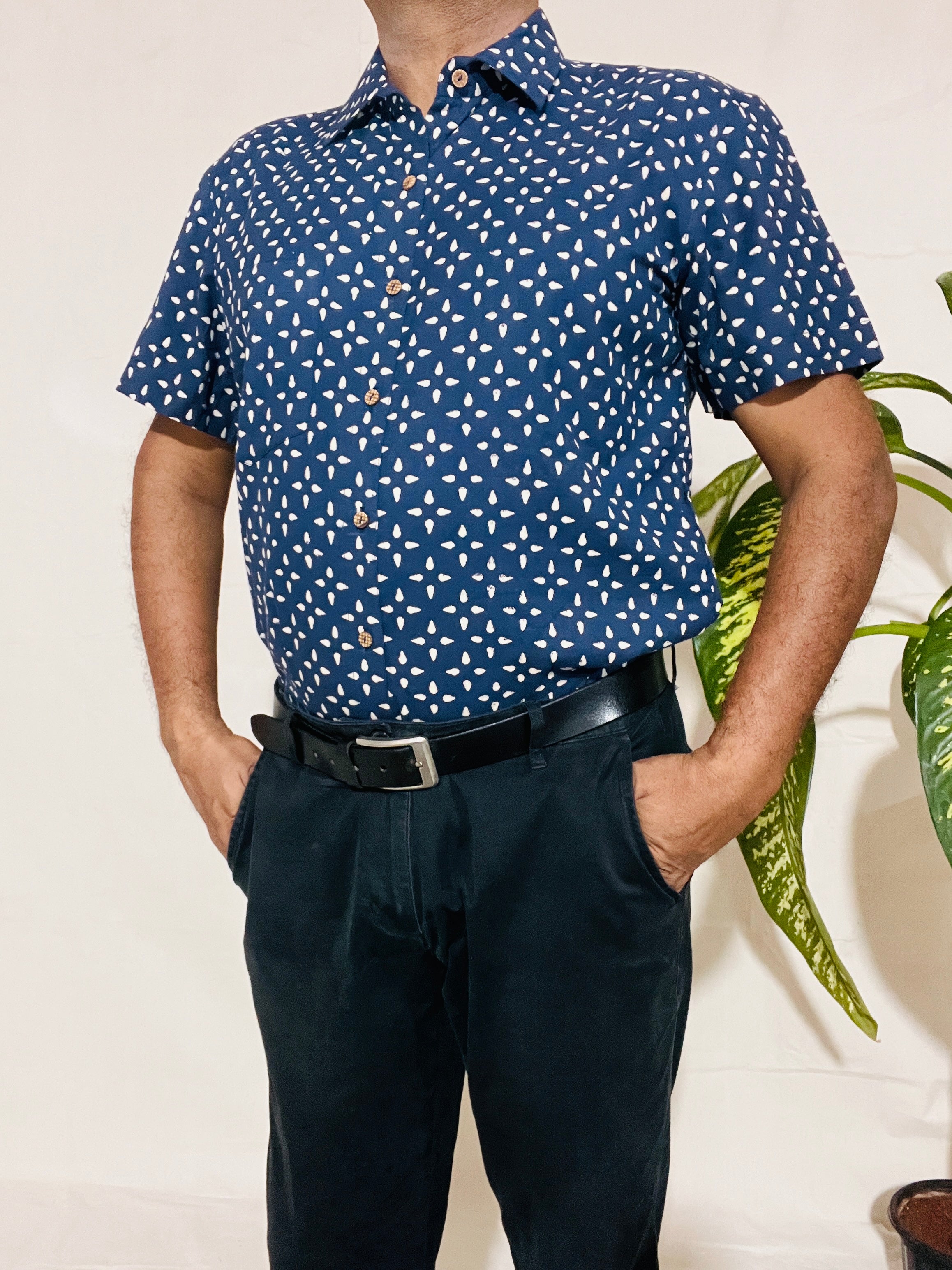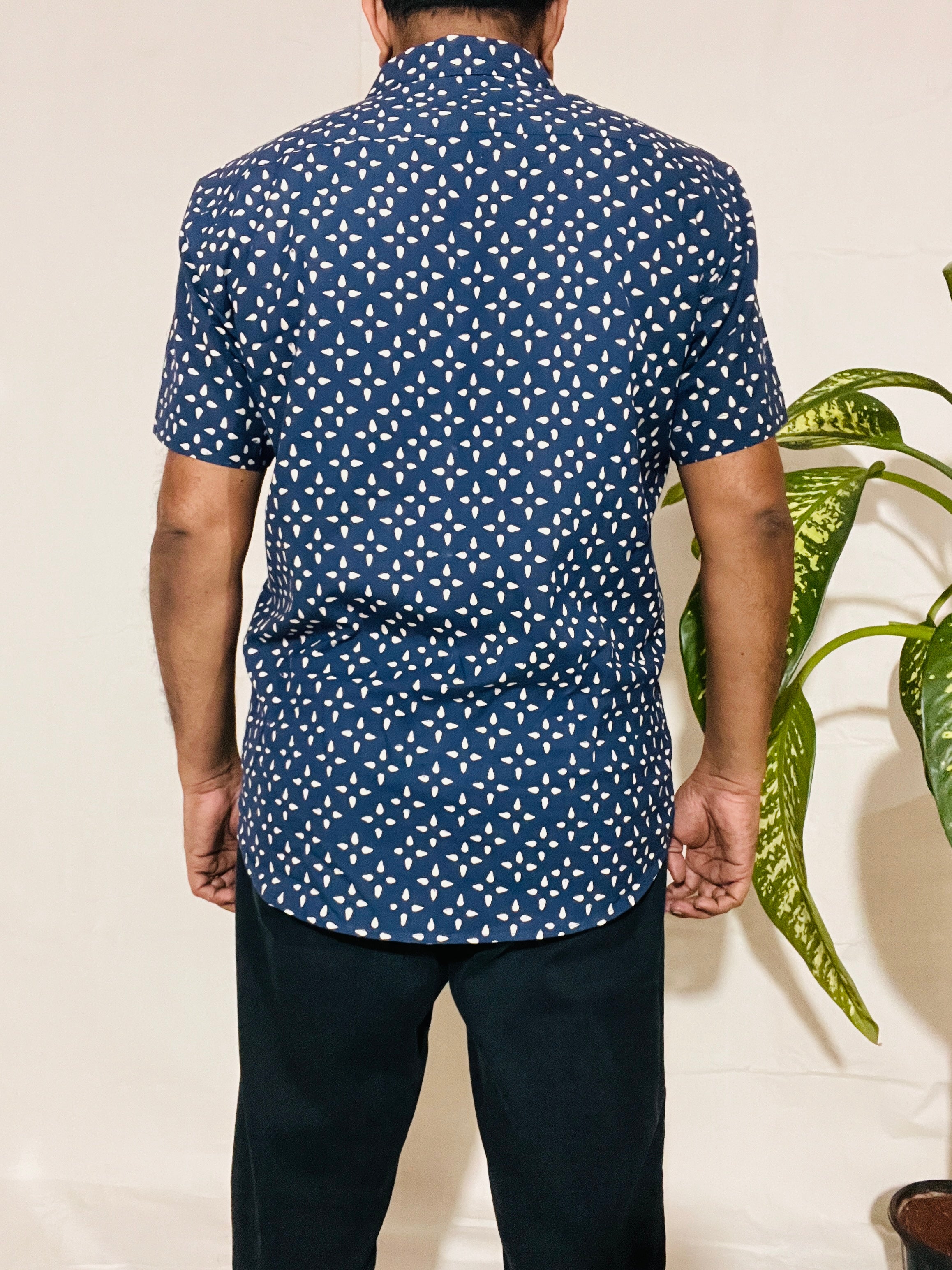 Men's Short Sleeve Shirt in White Blue Small Buti Print