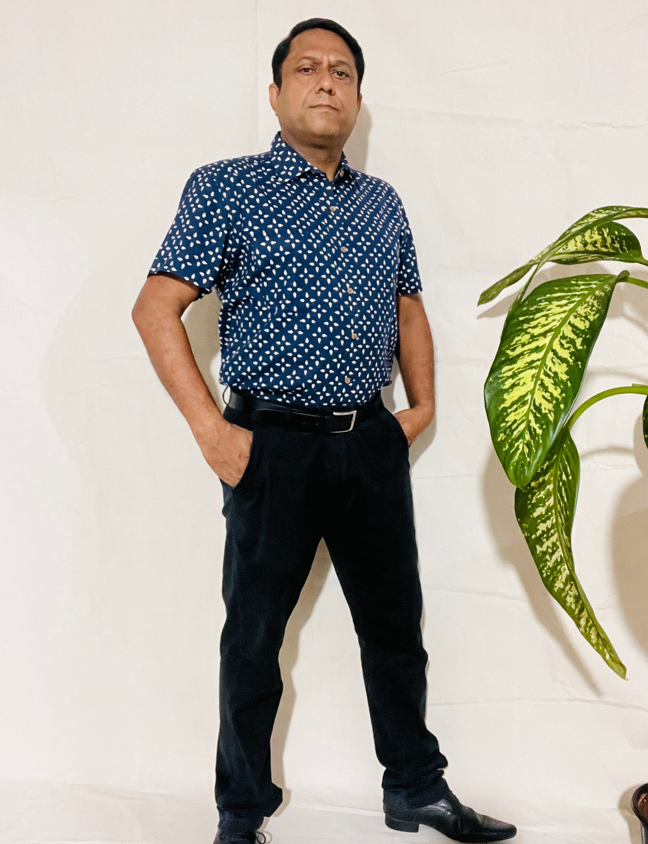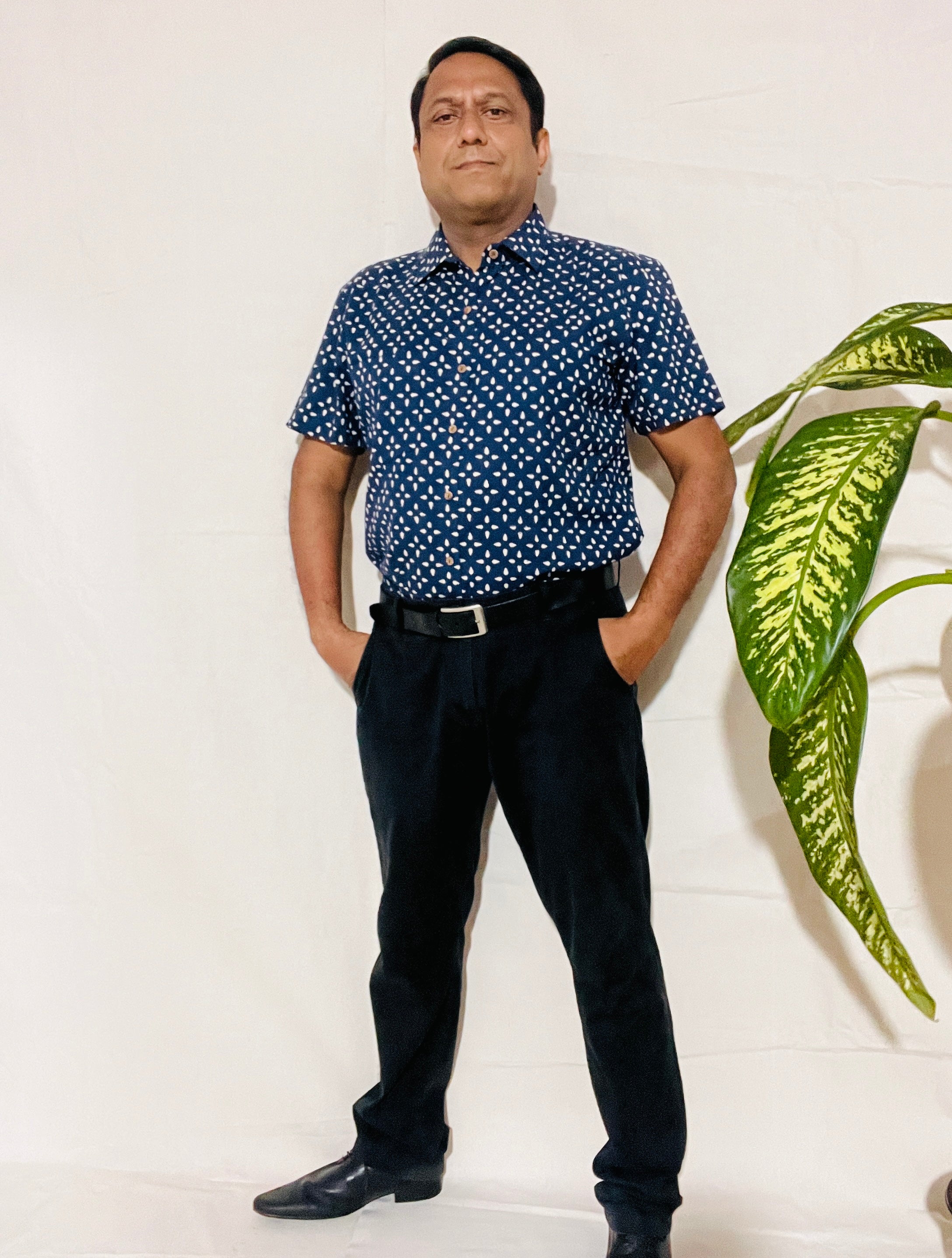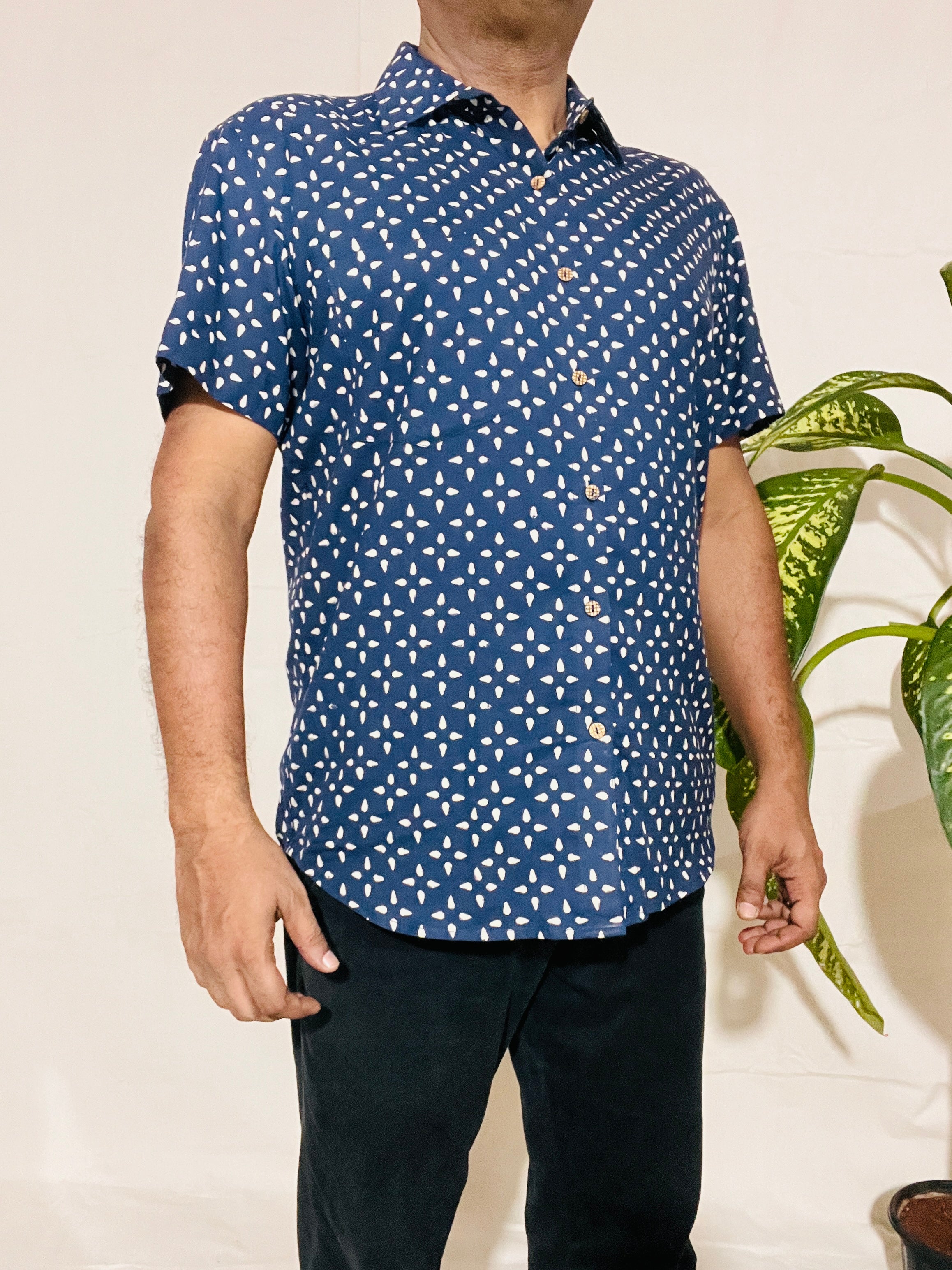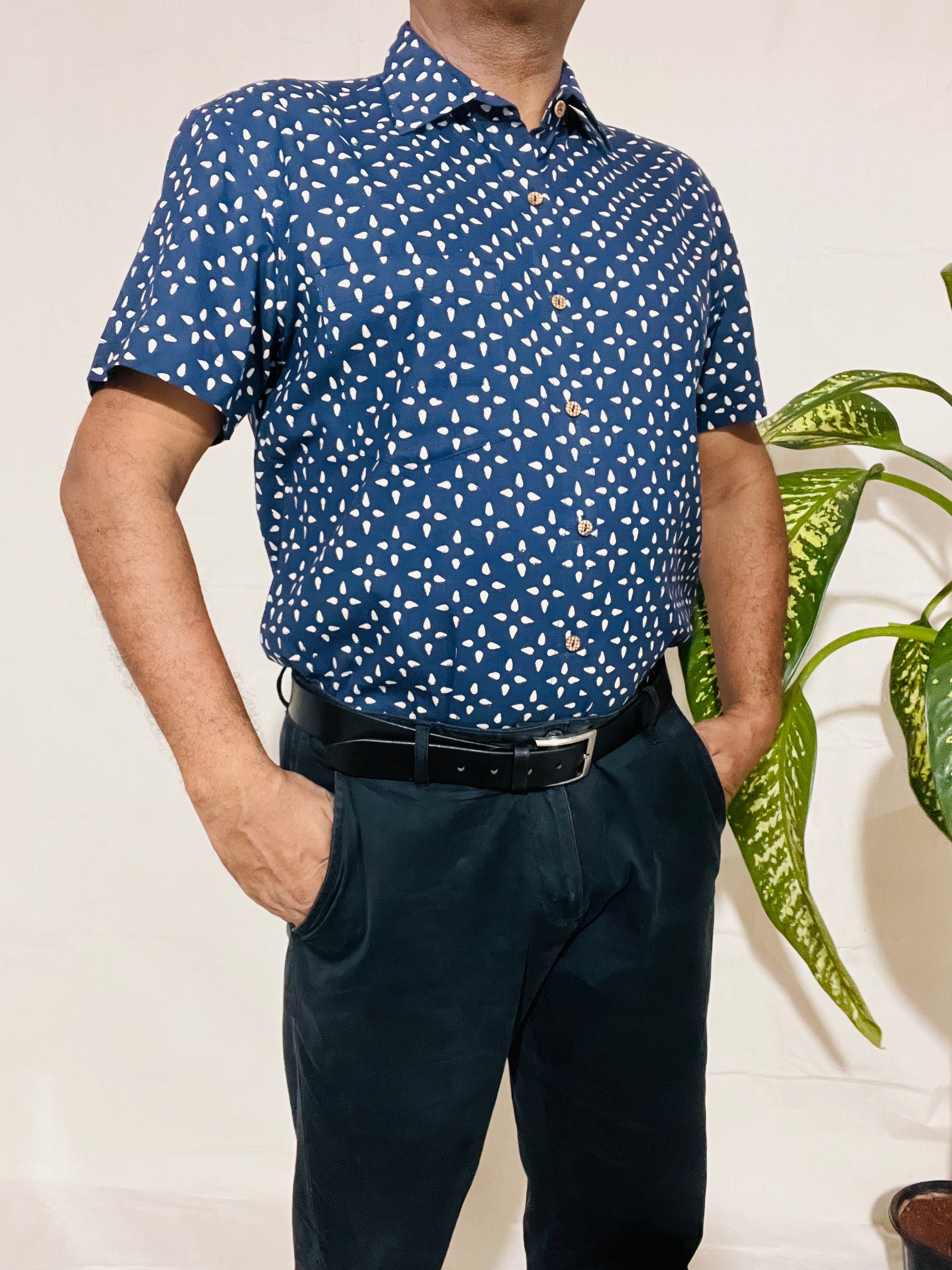 Men's Short Sleeve Shirt in White Blue Small Buti Print