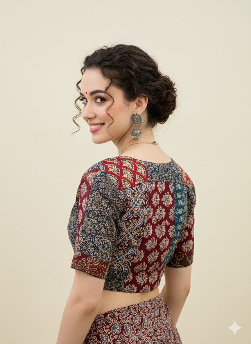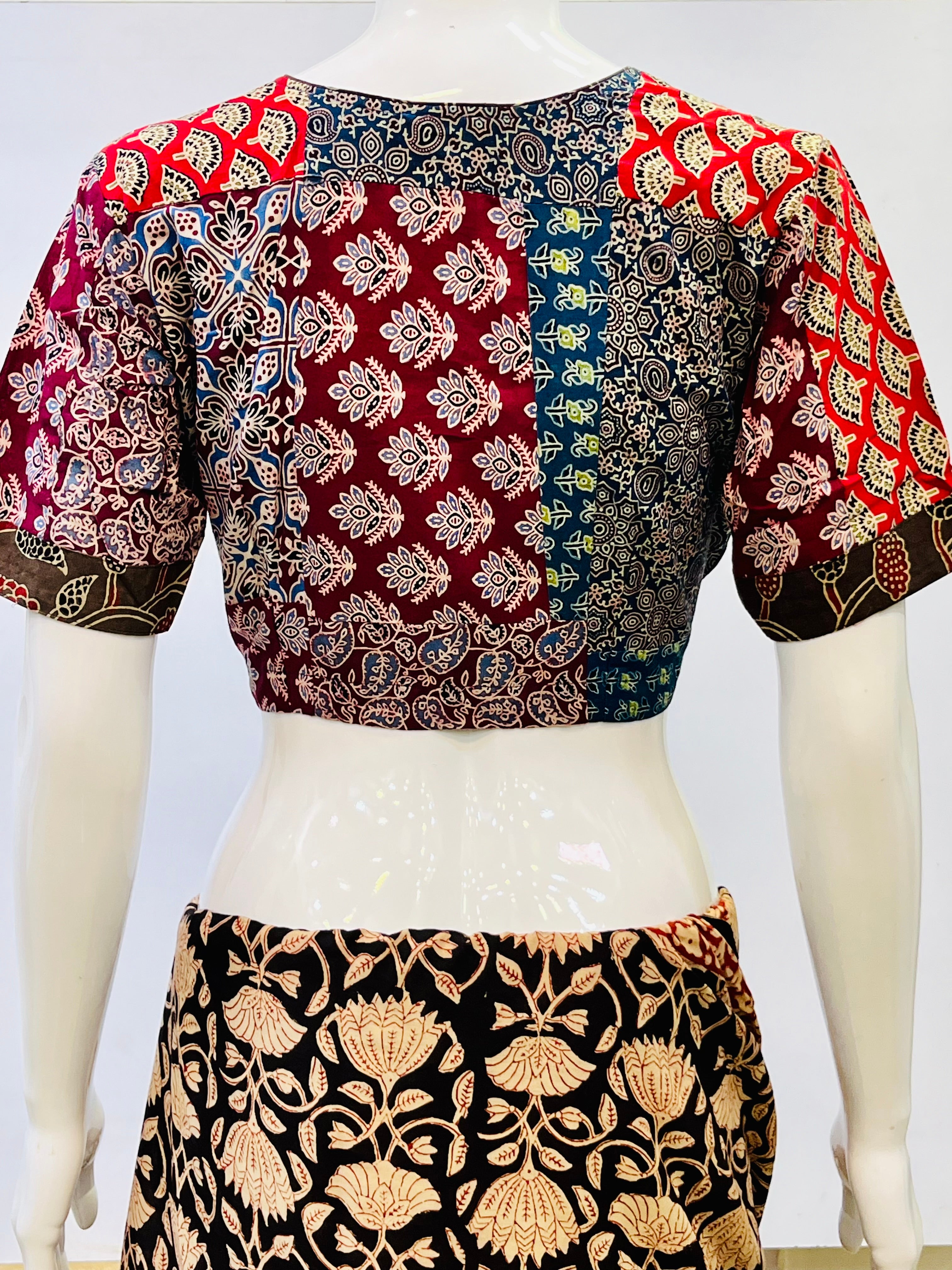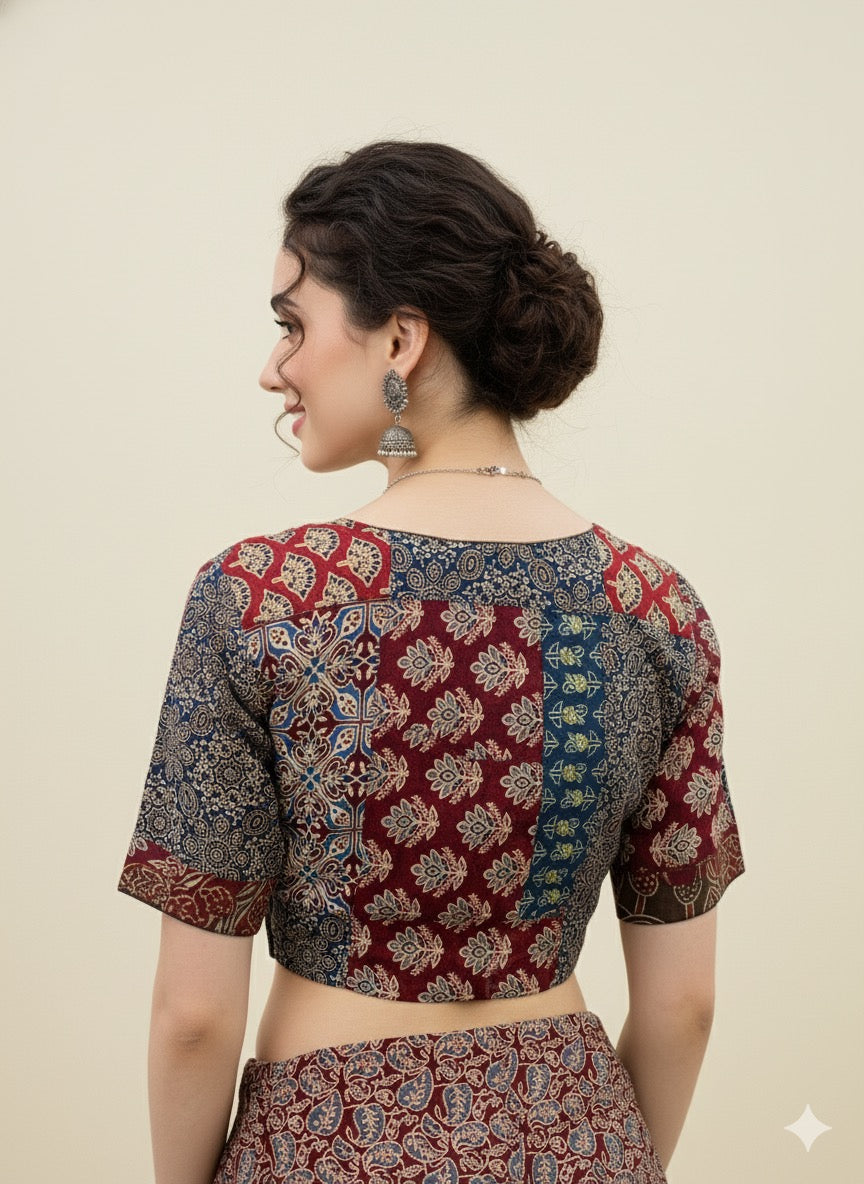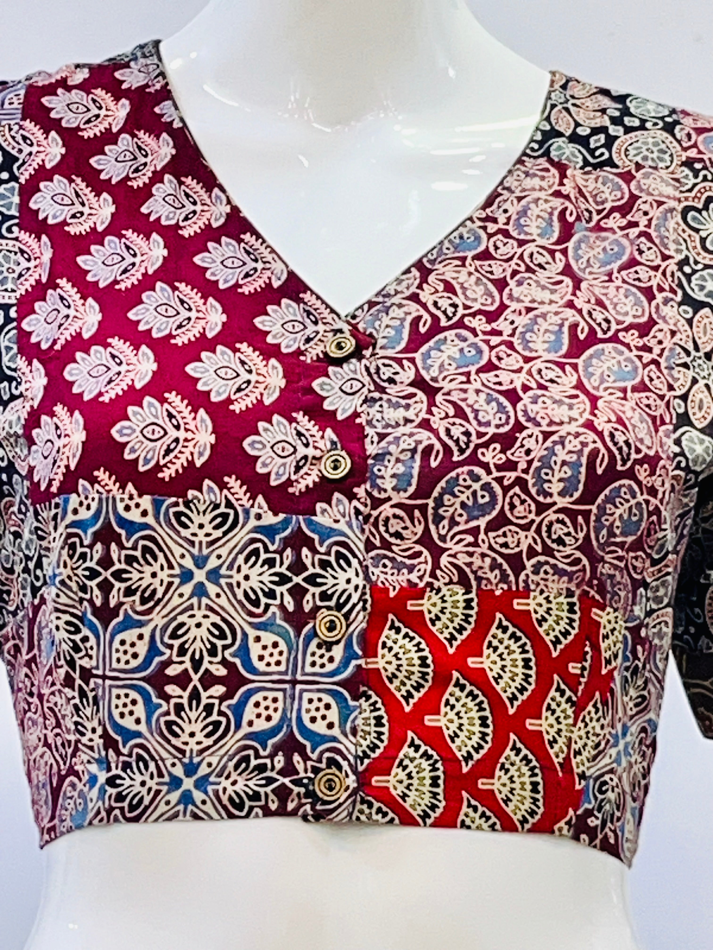 Ajrakj Patchwork fabric is created by sewing together various pieces of fabric, often geometric shapes, to form a larger pattern or design. This technique is commonly used in quilts, but can also be applied to other items like bags, rugs, and clothing. The resulting fabric is characterized by its pieced look and the use of different colors and textures.