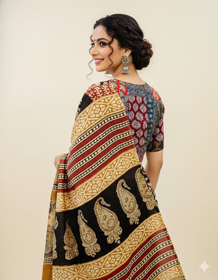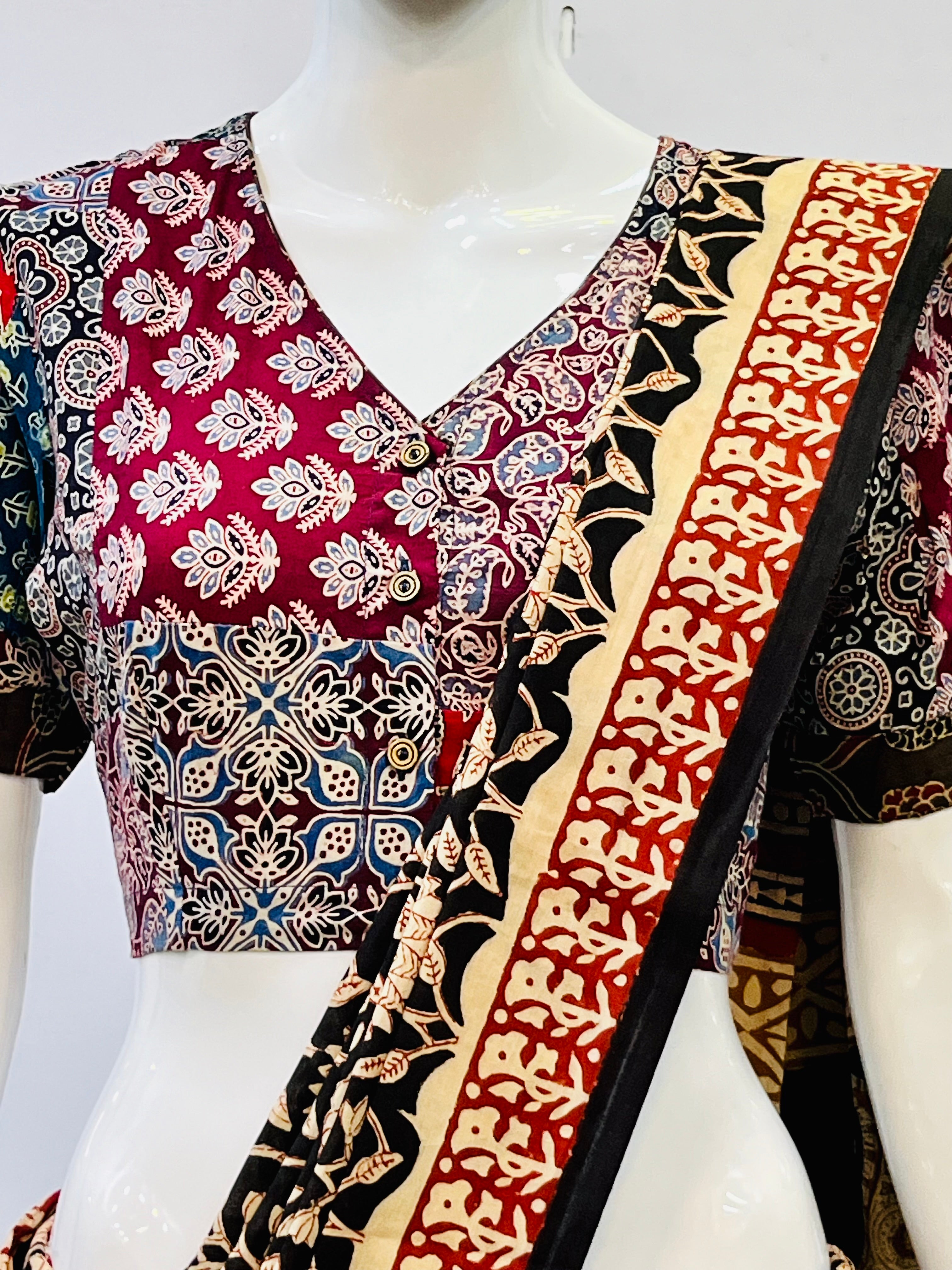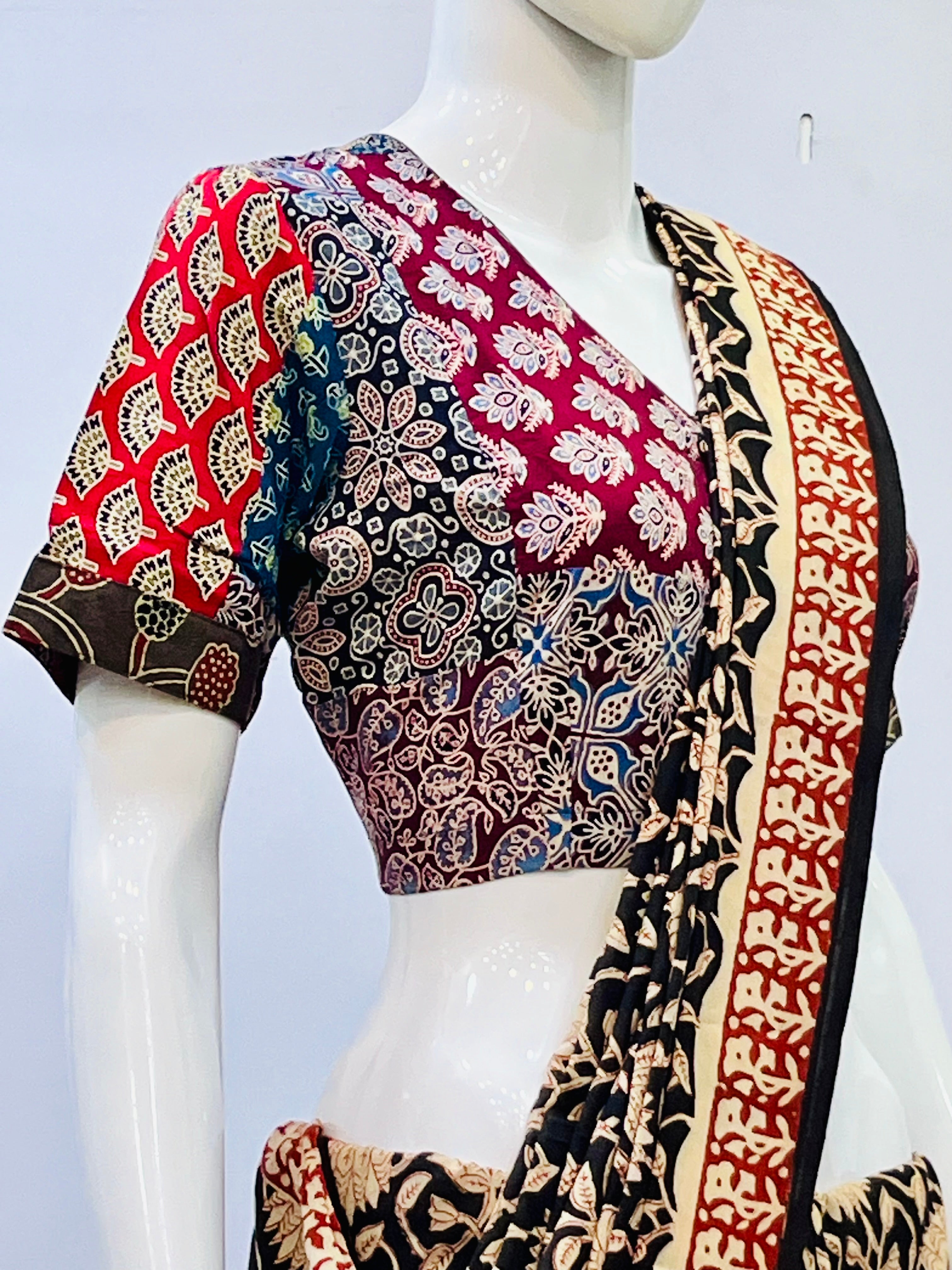 Ajrakj Patchwork fabric is created by sewing together various pieces of fabric, often geometric shapes, to form a larger pattern or design. This technique is commonly used in quilts, but can also be applied to other items like bags, rugs, and clothing. The resulting fabric is characterized by its pieced look and the use of different colors and textures.