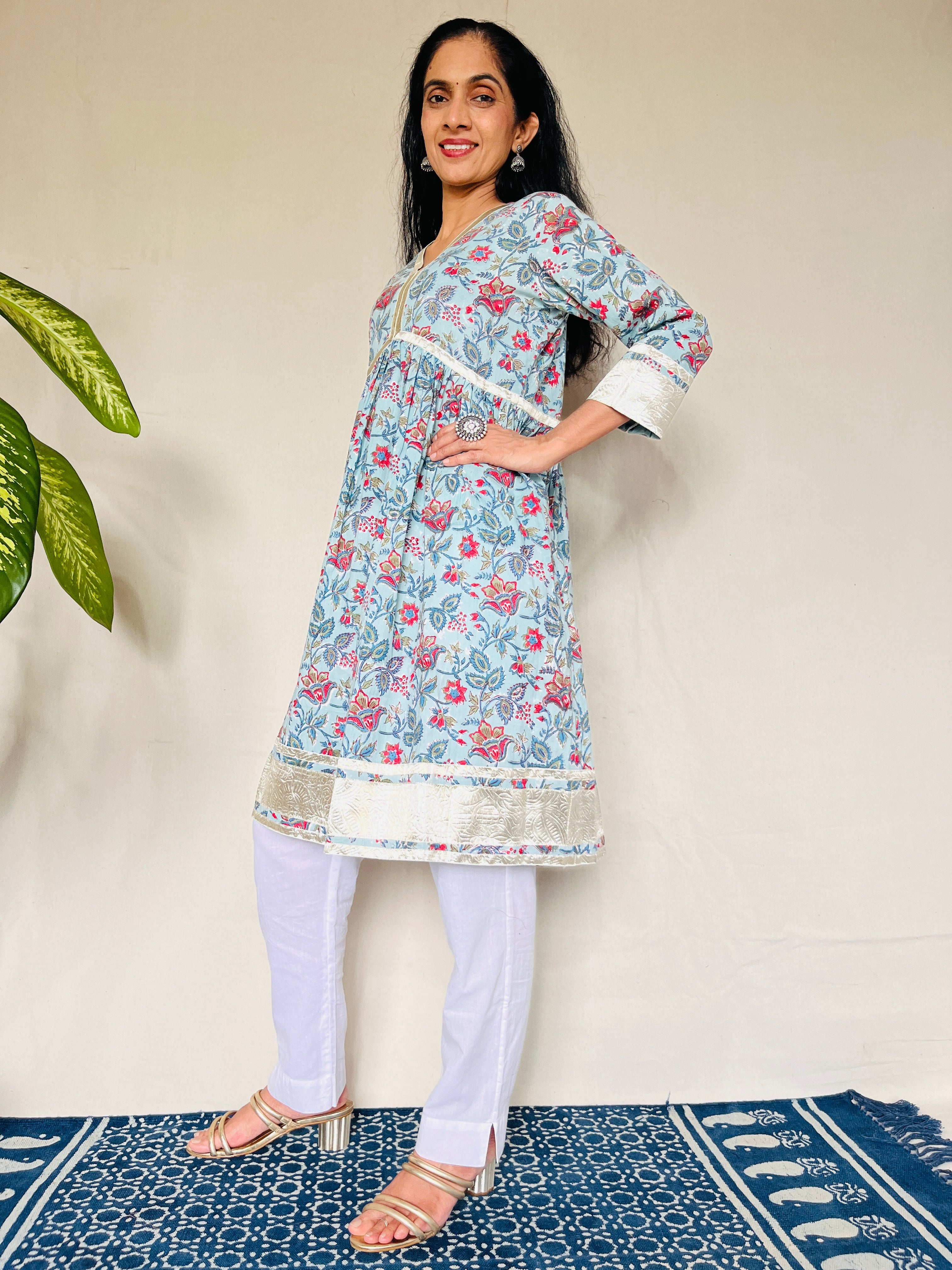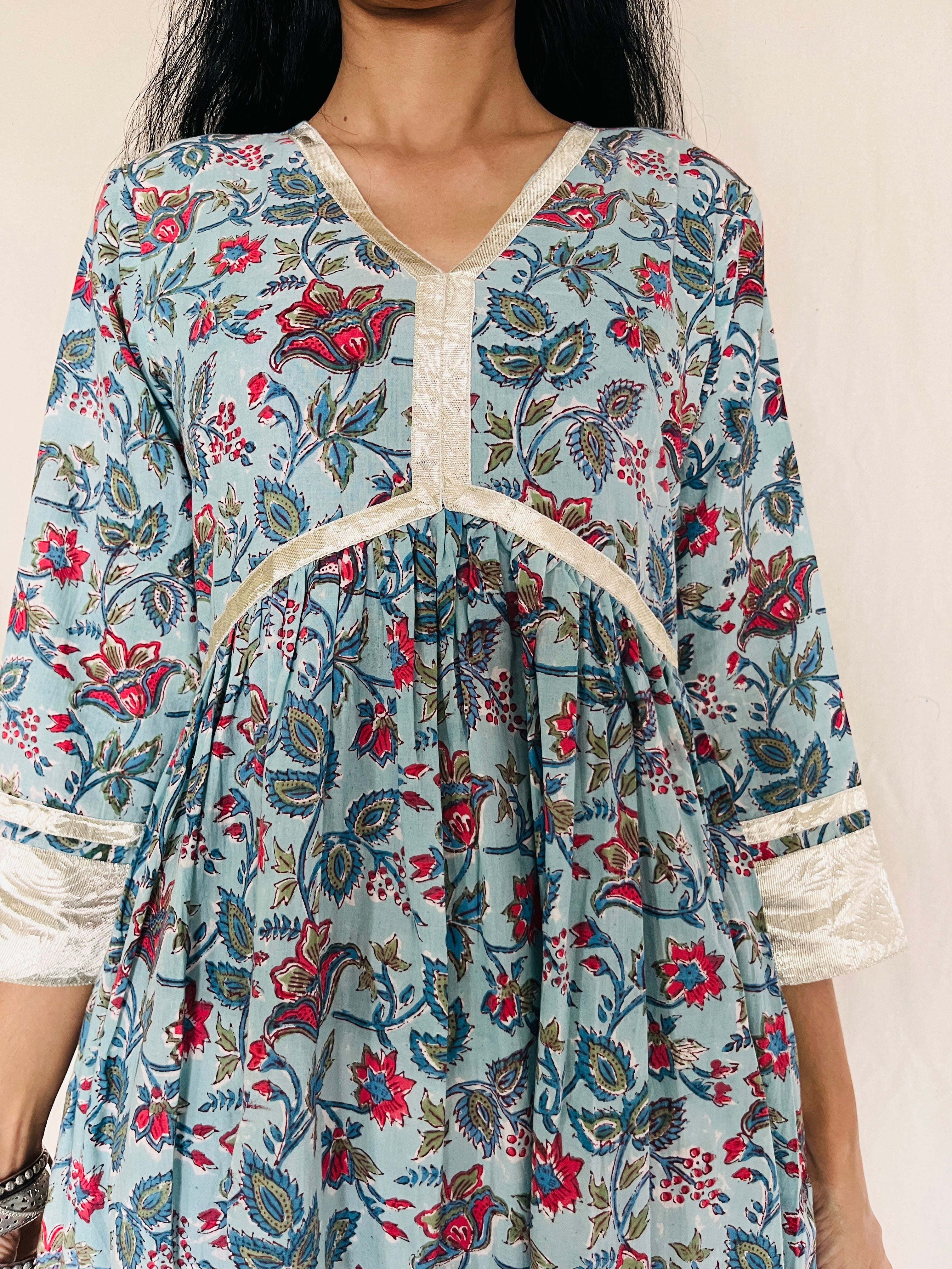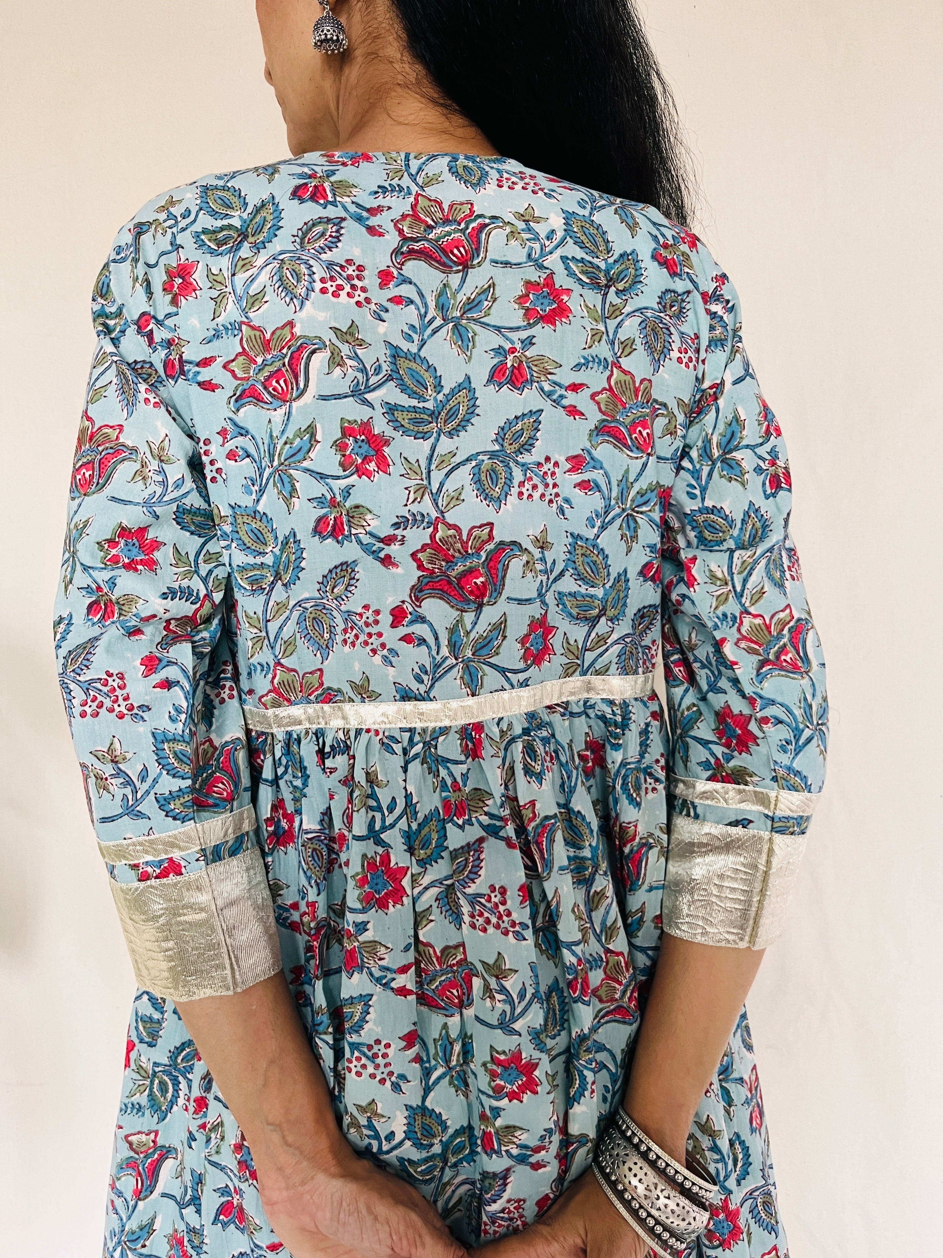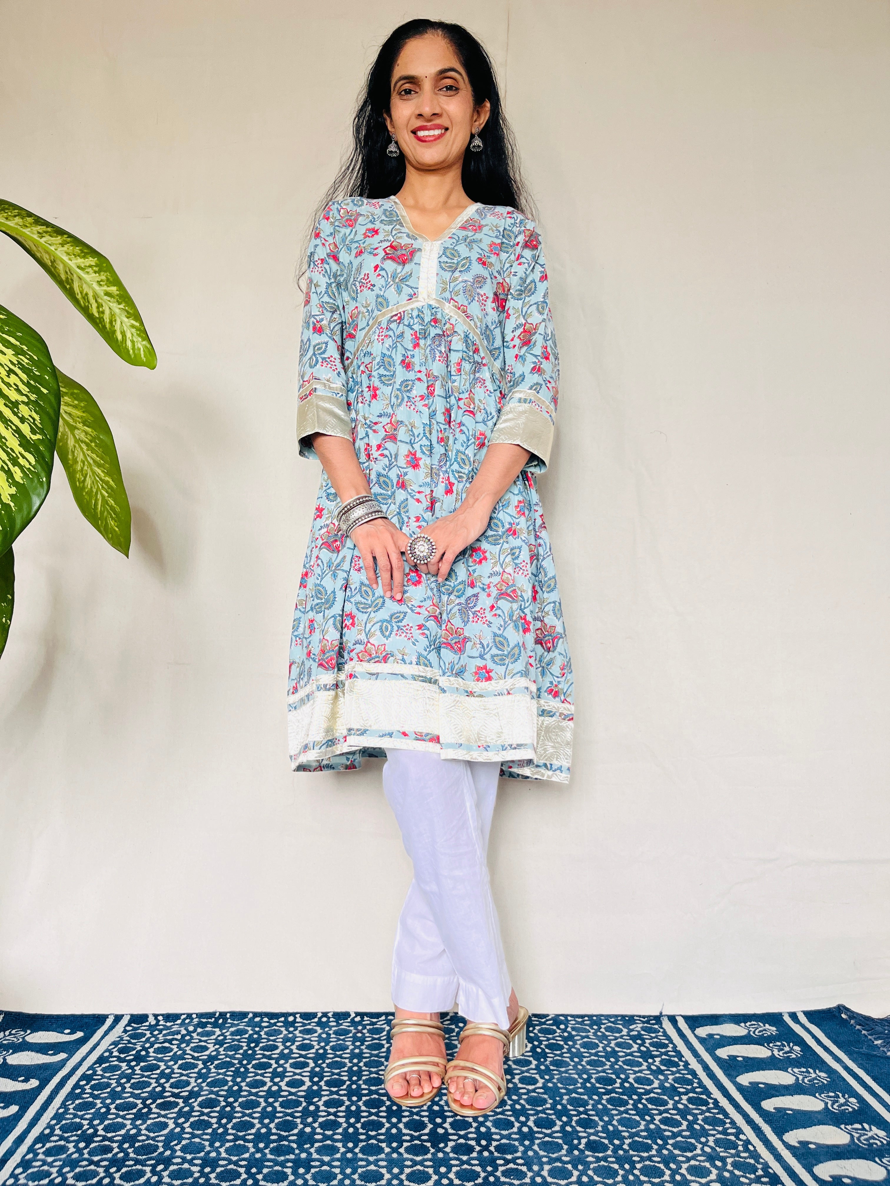 Anarkali Cut Sanganeri Printed Kurti in Original Hand Block Print.